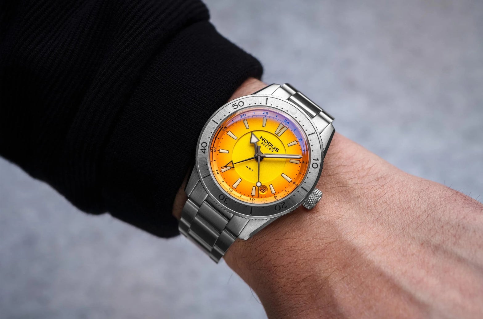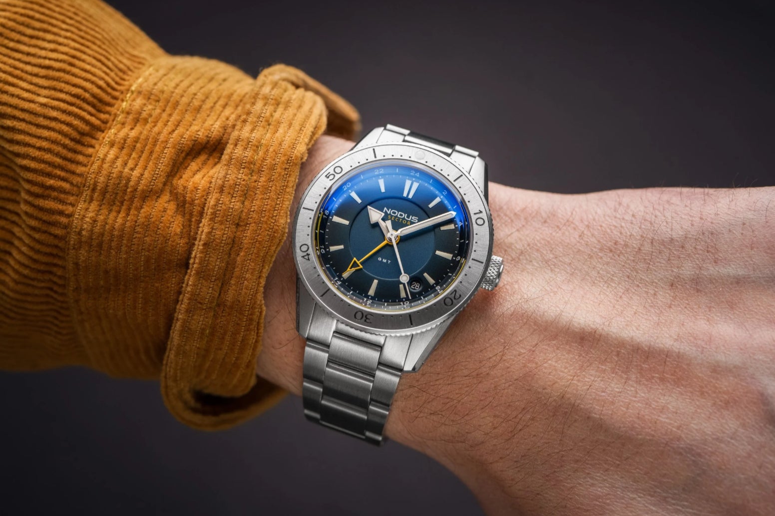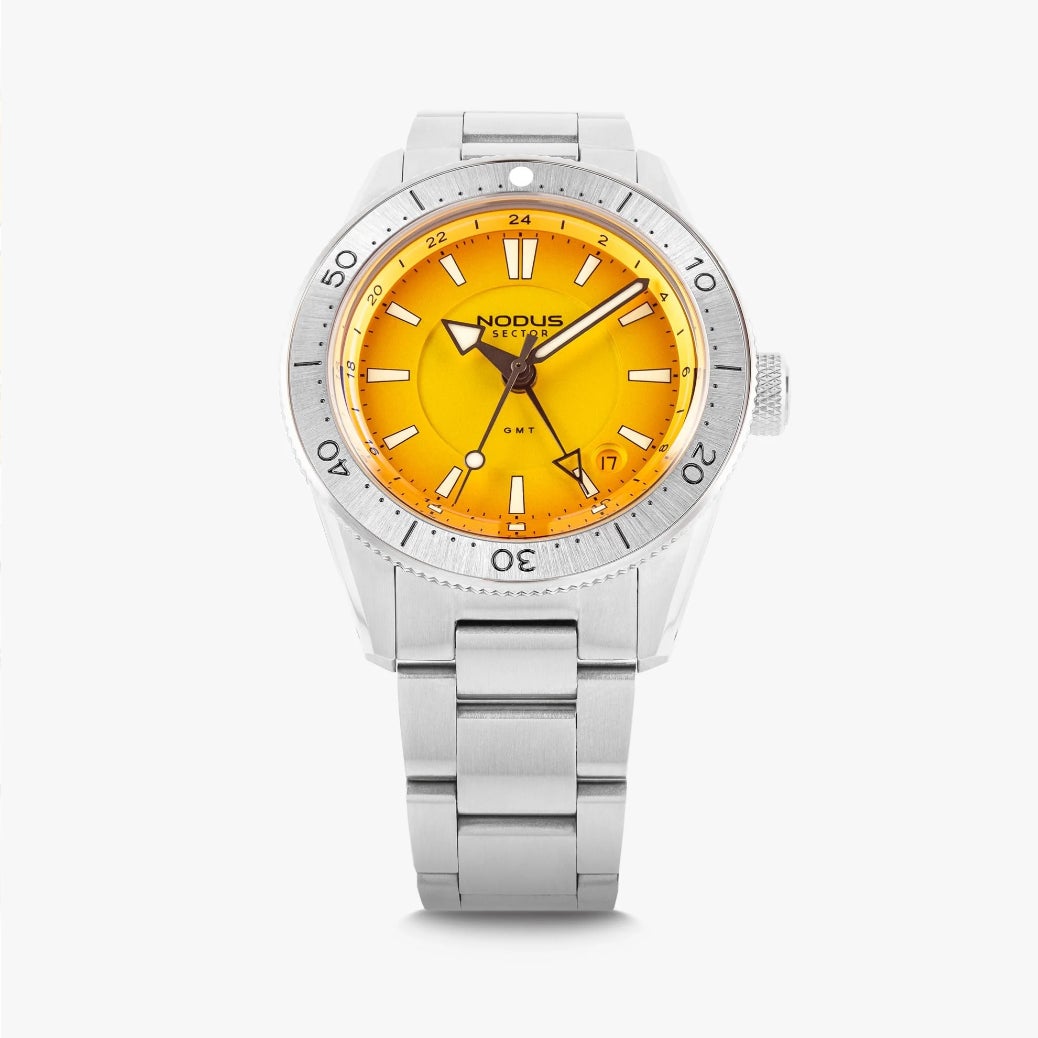 「Sector II Dive GMT」は、現代のニーズに合わせてダイバーズウォッチを再解釈。水中での揺るぎないパフォーマンスを追求した堅牢な設計と、必要不可欠な機能性により、近場から遠方まであらゆる冒険で信頼できるパートナーとなります。逆回転防止ベゼル、高視認性の蓄光針とインデックス、第2時間帯を表示する専用GMT針を搭載。ケースと風防は徹底的に再設計され、厚さわずか11.9mmという、SEIKO NHムーブメントを採用したモデルの中でも極めてスリムな仕様を実現。100m防水性能を維持しながら、この薄さを達成している。ボックス型サファイアクリスタルは、文字盤と針を従来よりもガラス面に近づけることで、デザイン効率と高級感を高めています。