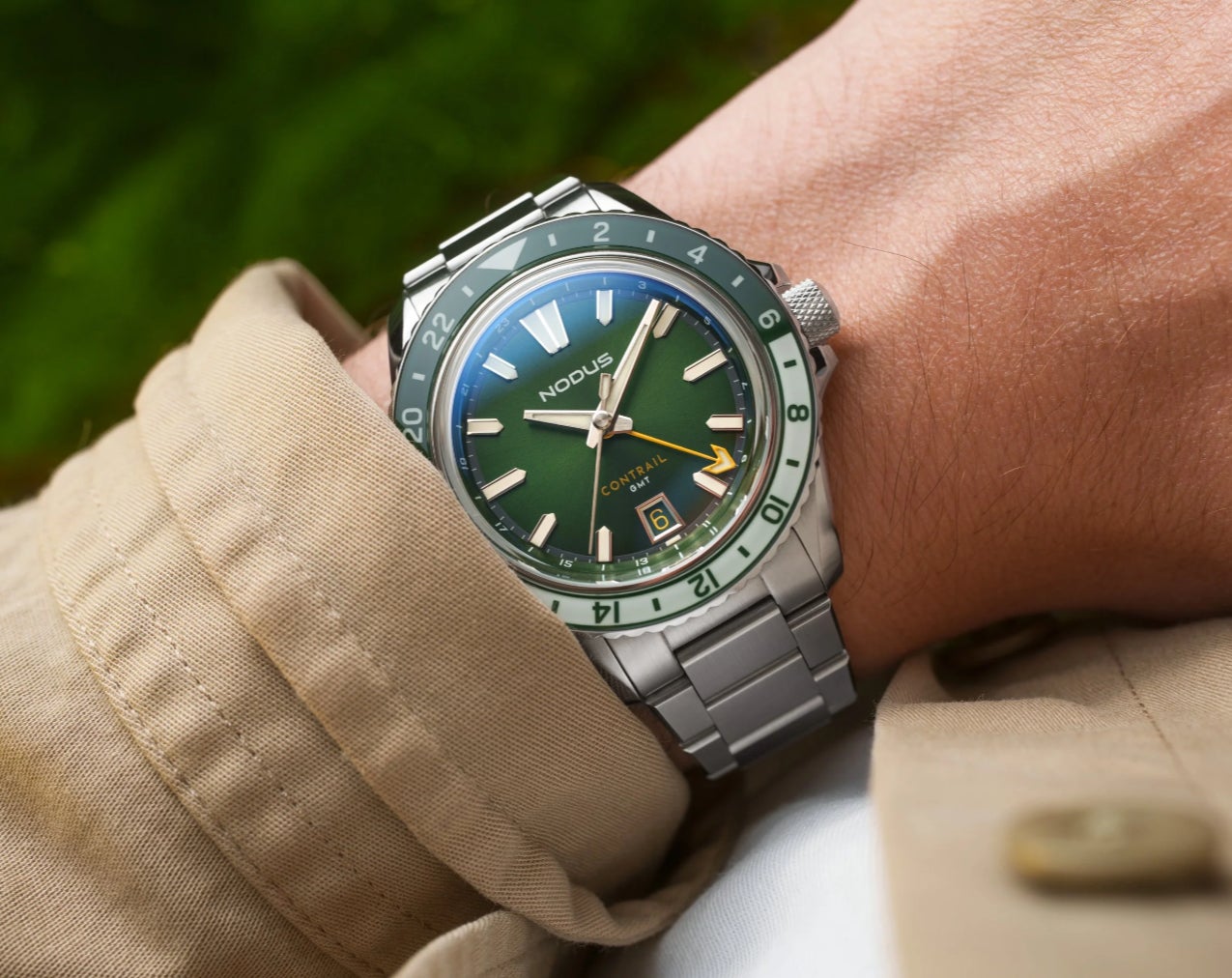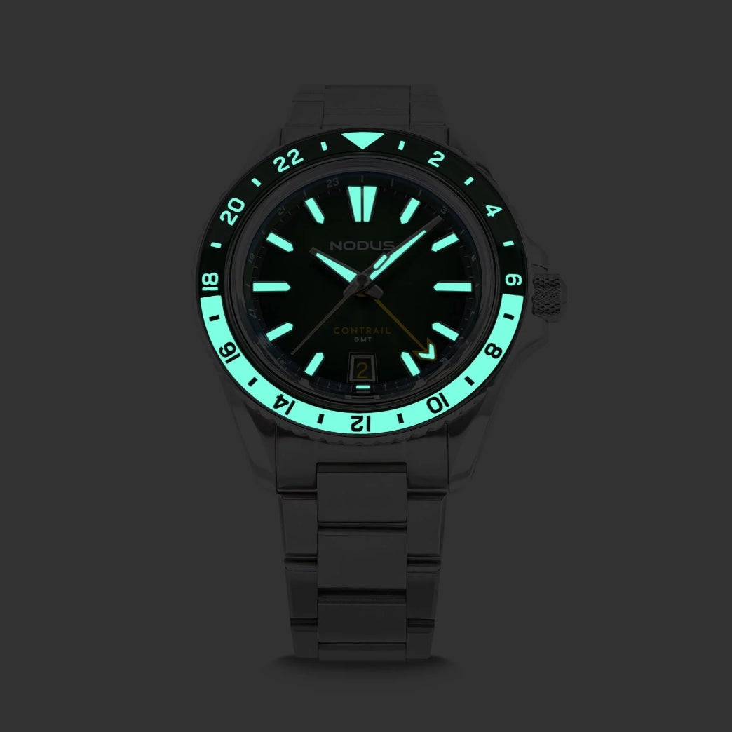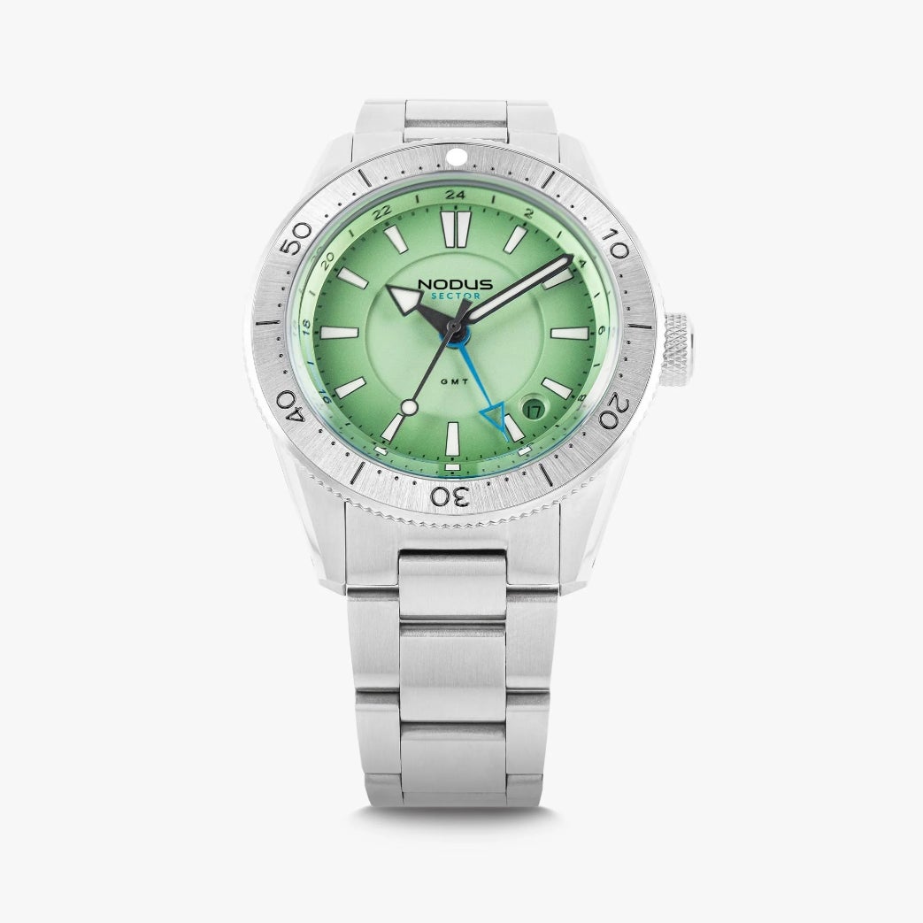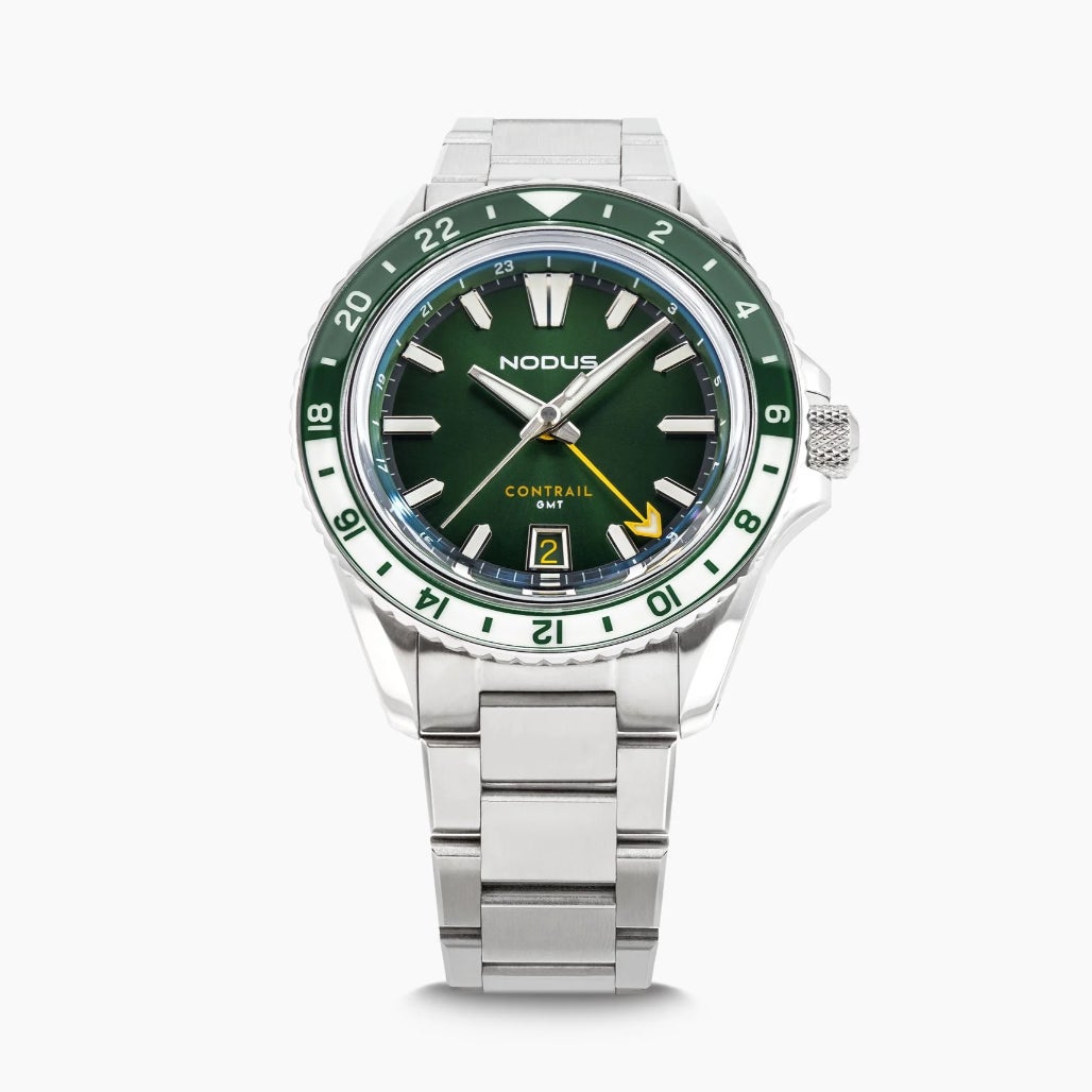 ブランドの「効率的なデザイン」哲学を体現する一本。市場でも最もスリムなケースプロファイルを実現しつつ、サンバーストのエバーグレードグリーンダイヤルと、グリーン×ホワイトのルミナスベゼルが調和した新色が登場。GMT針にはイエローをアクセントに採用し、時刻読みやすさとスタイリッシュな印象を両立しています。ムーブメントには日本製のMIYOTA9075を搭載、ノダス・ウォッチによる±8秒/日の調整済みで、信頼性と精度を確保。厚さ11.8 mmのスリムなケースに、48クリック式のバイディレクショナルベゼル、防水性能は200M。20→16 mmにテーパーするフラットリンク・ブレスレットには、クイックリリース付きで着脱も容易です。すべて米ロサンゼルスで設計・組立されており、「旅の相棒」としての完成度を誇る仕上がりです。