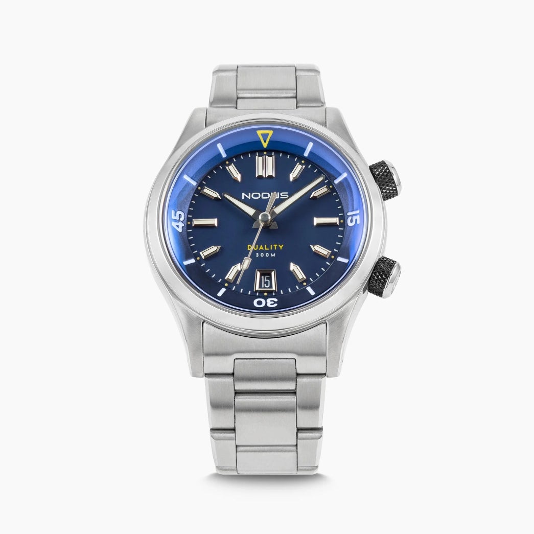 70年前に誕生したデュアルクラウン・ダイバーズウォッチを現代的に再構築した「Duality II Drift Blue」。深いブルーにわずかなヴィンテージフェードを施したダイヤルは、クラシックなコンプレッサー・ダイバーへのオマージュ。光の角度で豊かに表情を変え、海の深みと経年の美しさを同時に感じさせます。厚さわずか11.5mmのスリムケースに300m防水を備え、2時位置のスクリューダウン式クラウンで操作する内部回転ベゼルや、ハイポリッシュのファセット付きインデックスなど、伝統と革新を融合。ベゼルタイプは12時間/60分表記の2種類がラインナップ。