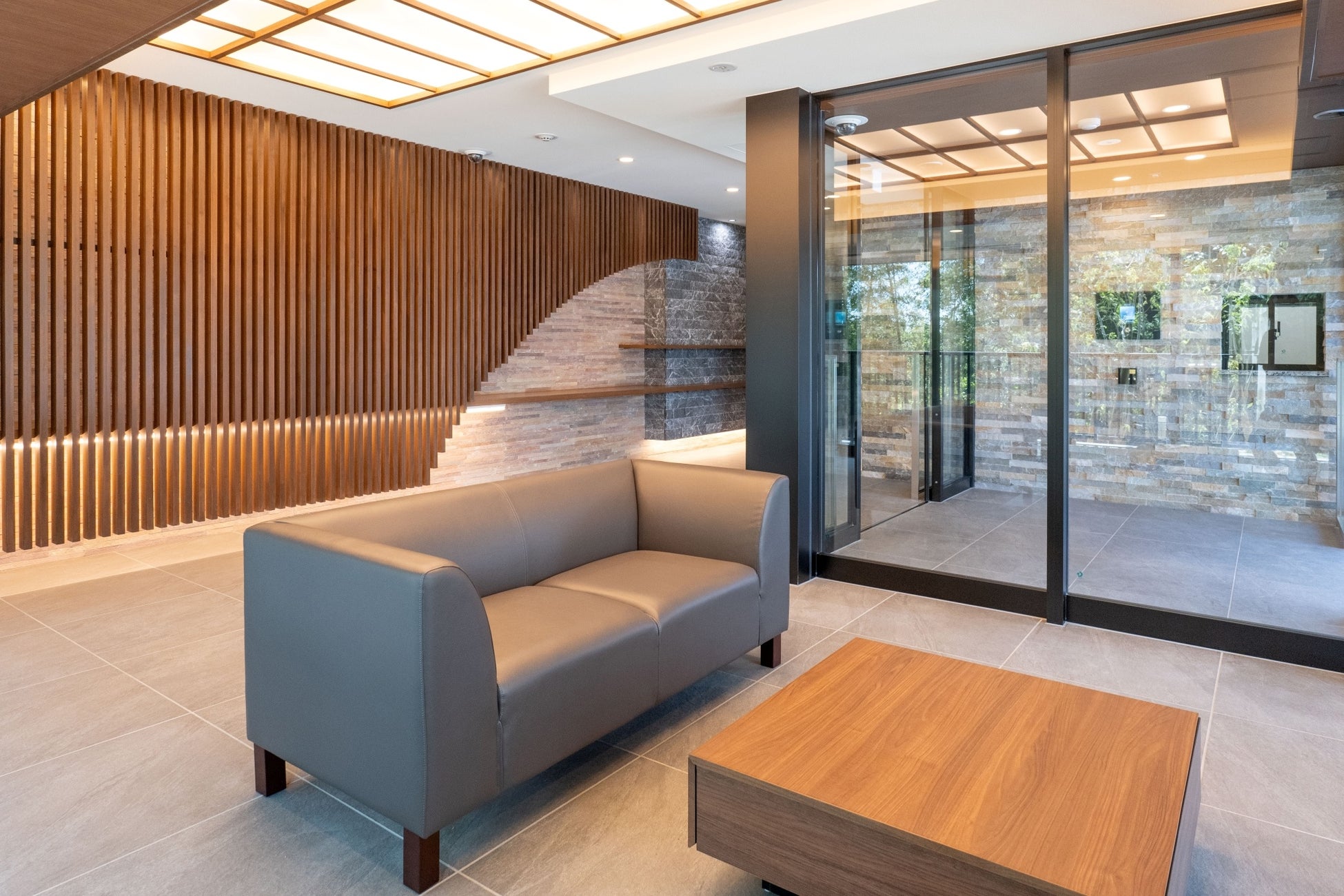 建築の外観は和モダンを基調としており、自然石と木格子の組み合わせが、高級感あふれるファサードを創出しています。