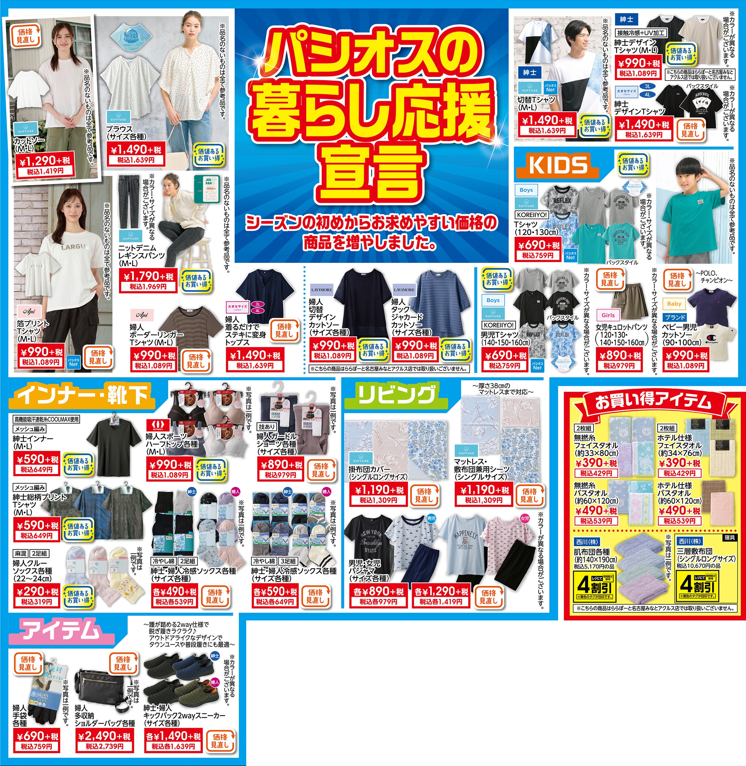 パシオスでは、シーズンの初めからお求めやすい価格の[価格を見直した商品]と[価値あるお買い得品]の商品を増やし、[パシオスの暮らし応援宣言]として、この春から実施しております。