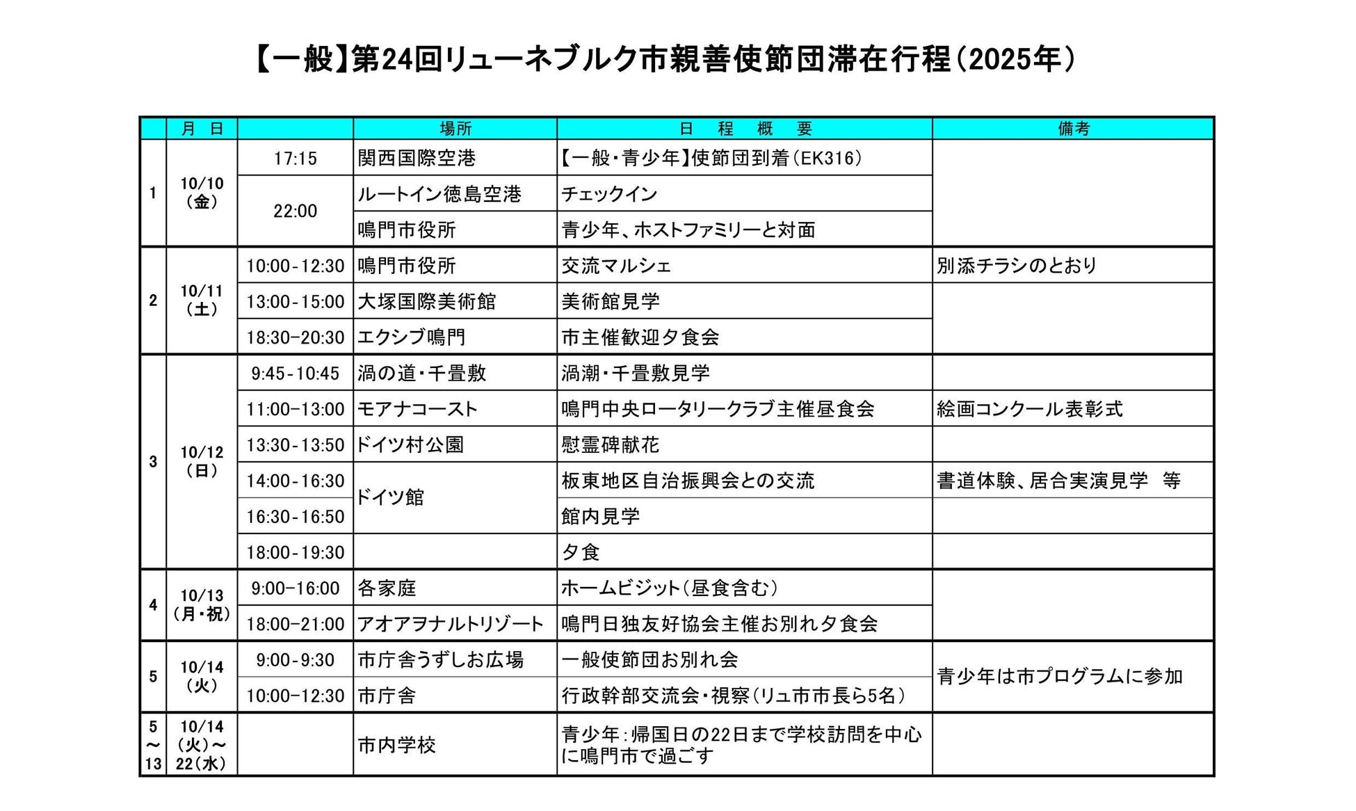 滞在中は、各種交流行事や鳴門市民の家庭を訪問するホームビジットなどを通して鳴門市民とさらなる交流を深める予定です。