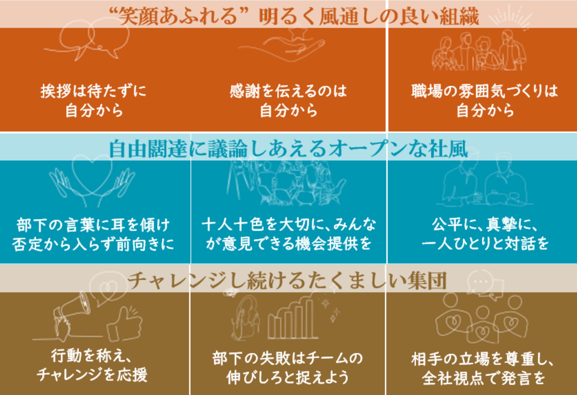 当社が目指す組織風土に資する心構えと立ち居振る舞いを「ふぅるまい」と定義し、9つの「ふぅるまい」を集録した「ふぅるまいbook」を全マネジメント職が共有、「ふぅ」があふれる組織文化を育んでいます。