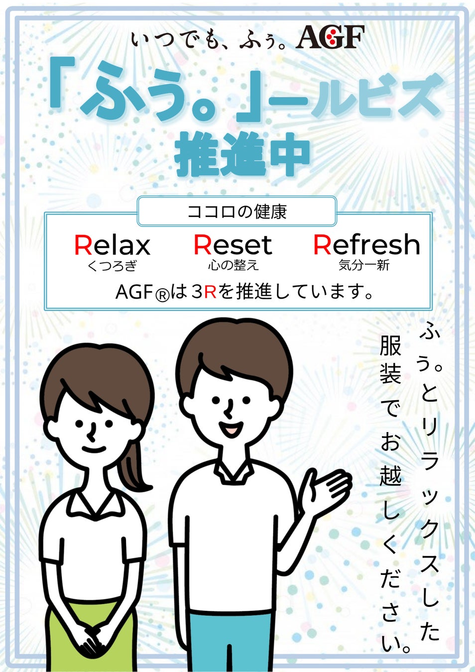 コーポレートスローガンである「いつでも、ふぅ。AGF®」を実践。「ココロとカラダの健康」、「人と人とのつながり」、「地球環境との共生」をはじめとするサステナブルな社会の実現を目指し、明日のよりよい生活に貢献します。