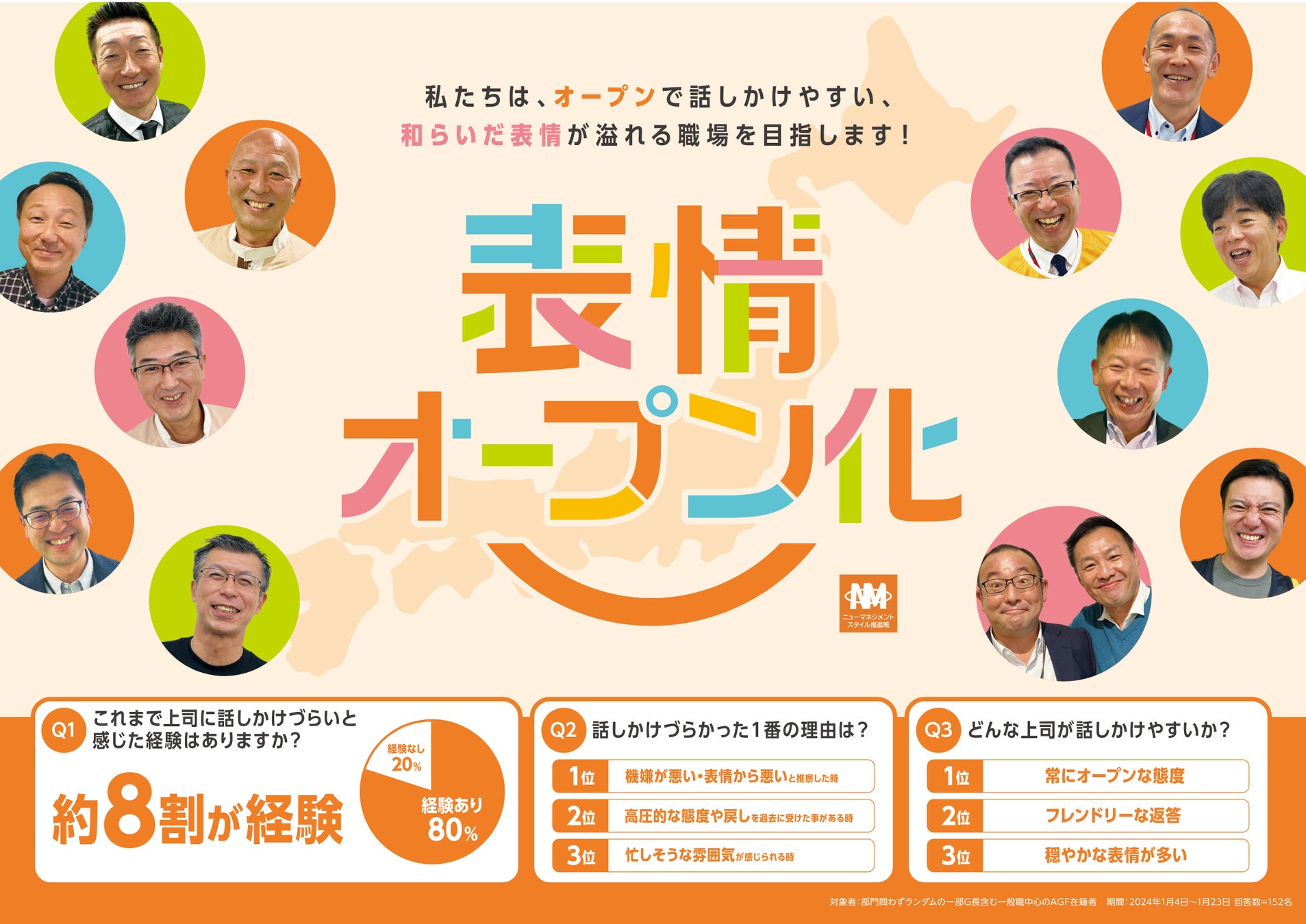 全国事業所長の笑顔写真を掲載したポスターを作成し、表情から気軽に話しかけることができるような、開放的で親しみやすい態度をとることを意識する取り組みです。