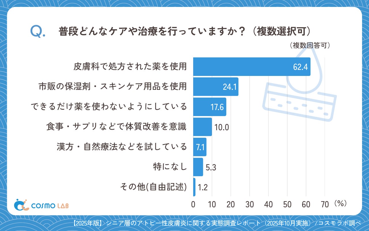 「皮膚科で処方された薬を使用」(62.4%)と回答したシニアが中心で、続いて「市販の保湿剤・スキンケア用品を使用」(24.1%)という回答結果になりました。