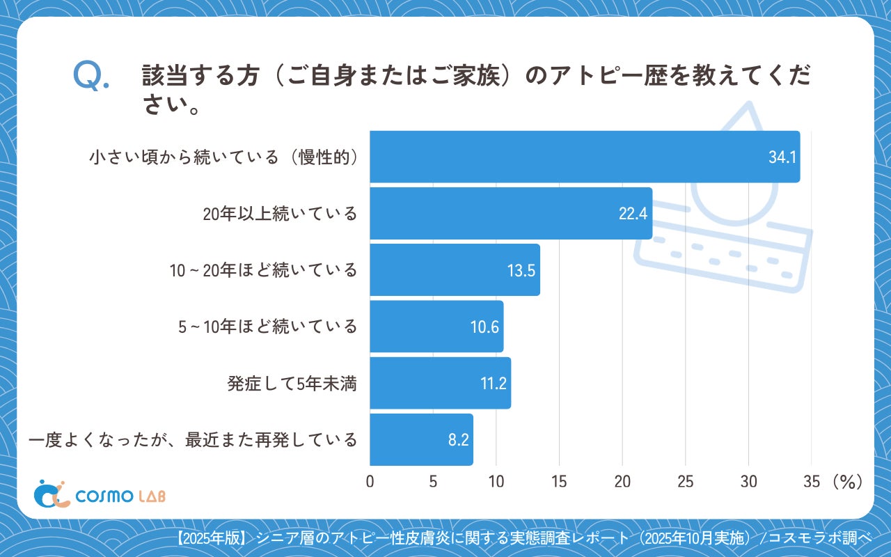 症状を持つ人は自分と家族を合わせて7.4%でしたが、「家族にいる」(16.3%)も一定数見られ、家庭の中でケアや受診の判断を考える場面が少なくないことがうかがえます。当事者または家族当事者に限ると、アトピー歴は「小さい頃から続いている」(34.1%)や「20年以上続いている」(22.4%)が多く、長く付き合いながら症状を管理している人が多い状況でした。