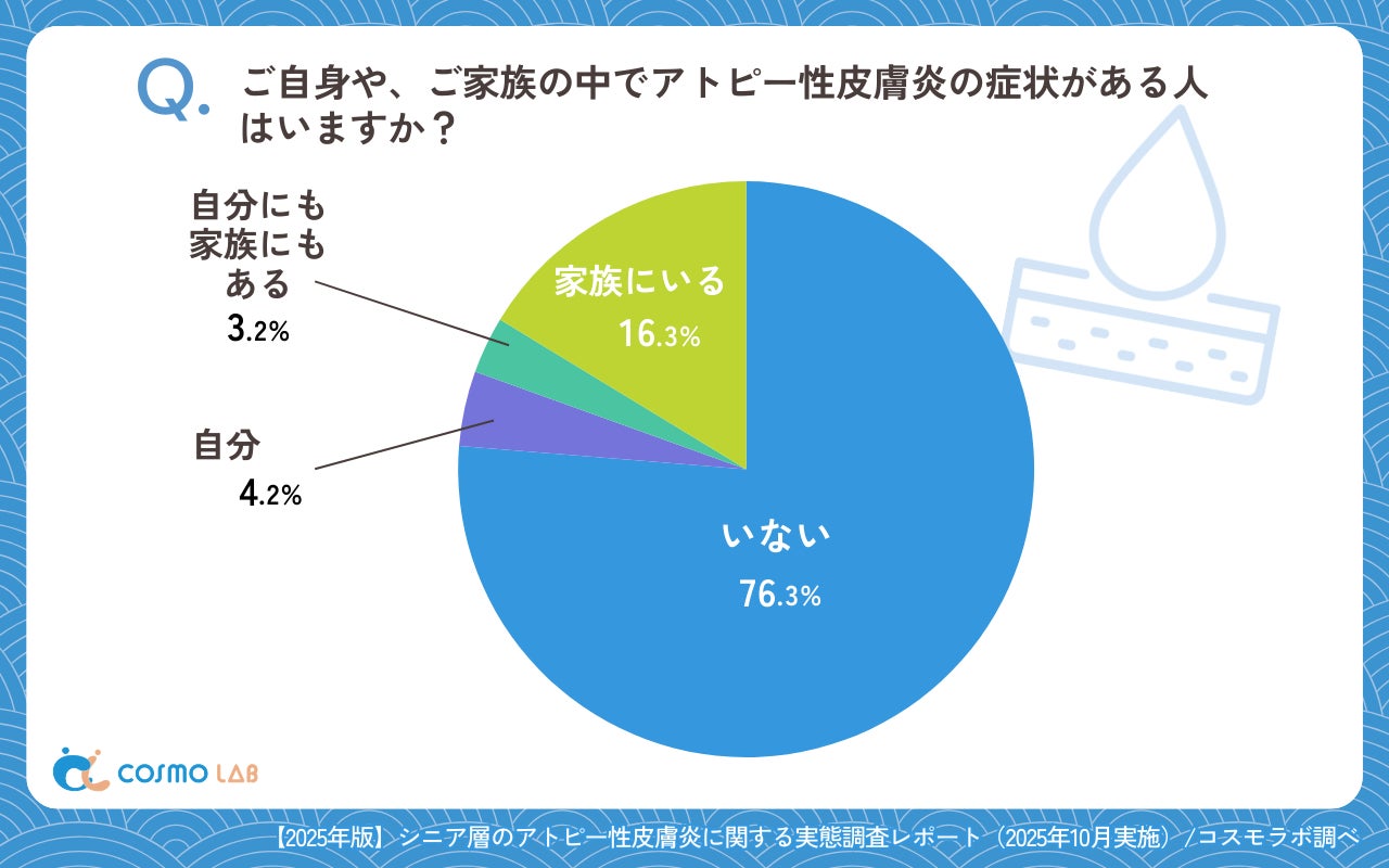 このことから、自分にアトピー性皮膚炎の症状があるシニアは少数派だと分かりました。一方で、自分の家族が当事者であるケースは、一定数において見受けられます。