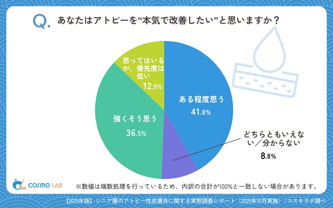 「ある程度思う」(41.8%)が最多で、「強くそう思う」(36.5%)が続き、アトピー性皮膚炎を改善したいと考えるシニアが多いと分かりました。