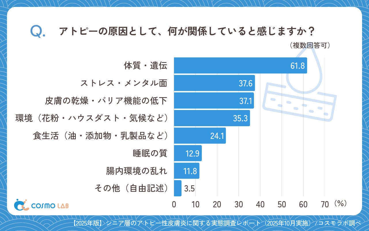 次いで「ストレス・メンタル面」(37.6%)という結果になりました。「皮膚の乾燥・バリア機能の低下」(37.1%)も高く、日常の保湿行動と原因の認識がつながることが示唆されました。