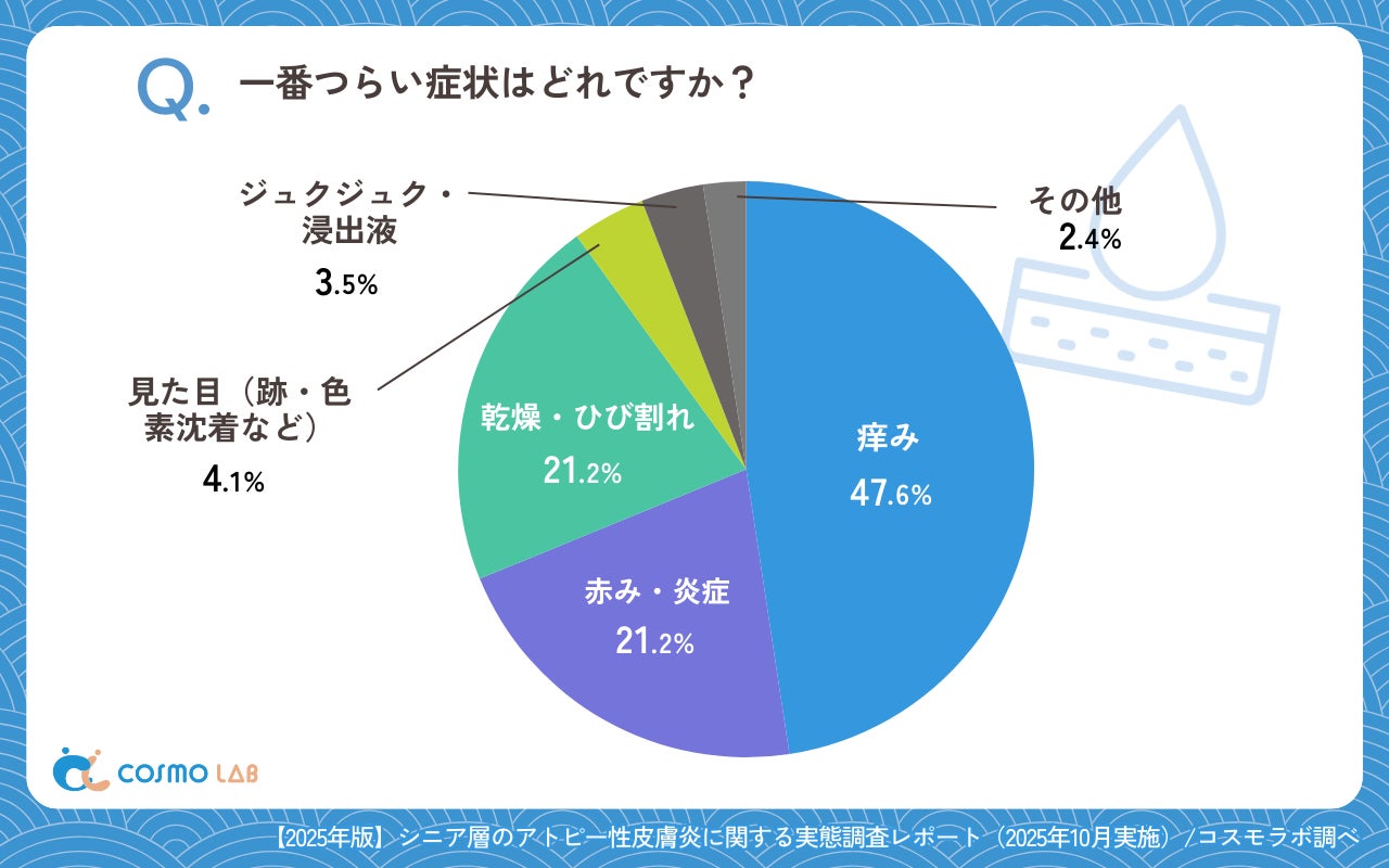 最多は「痒み」(47.6%)で、「赤み・炎症」(21.2%)と「乾燥・ひび割れ」(21.2%)が同率で続きました。