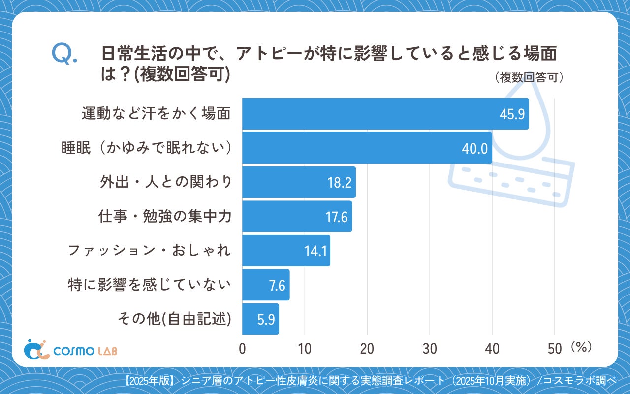 「運動など汗をかく場面」(45.9%)が最多で、「睡眠(かゆみで眠れない)」(40.0%)と続きました。