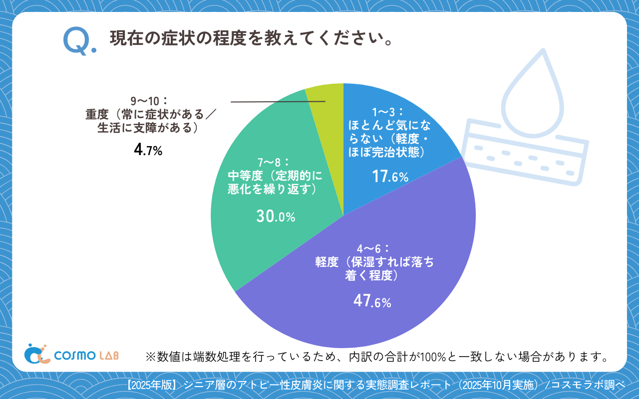 「4〜6:軽度(保湿すれば落ち着く程度)」(47.6%)と回答したシニアが中心で、「7〜8:中等度(定期的に悪化を繰り返す)」(30.0%)が続きました。