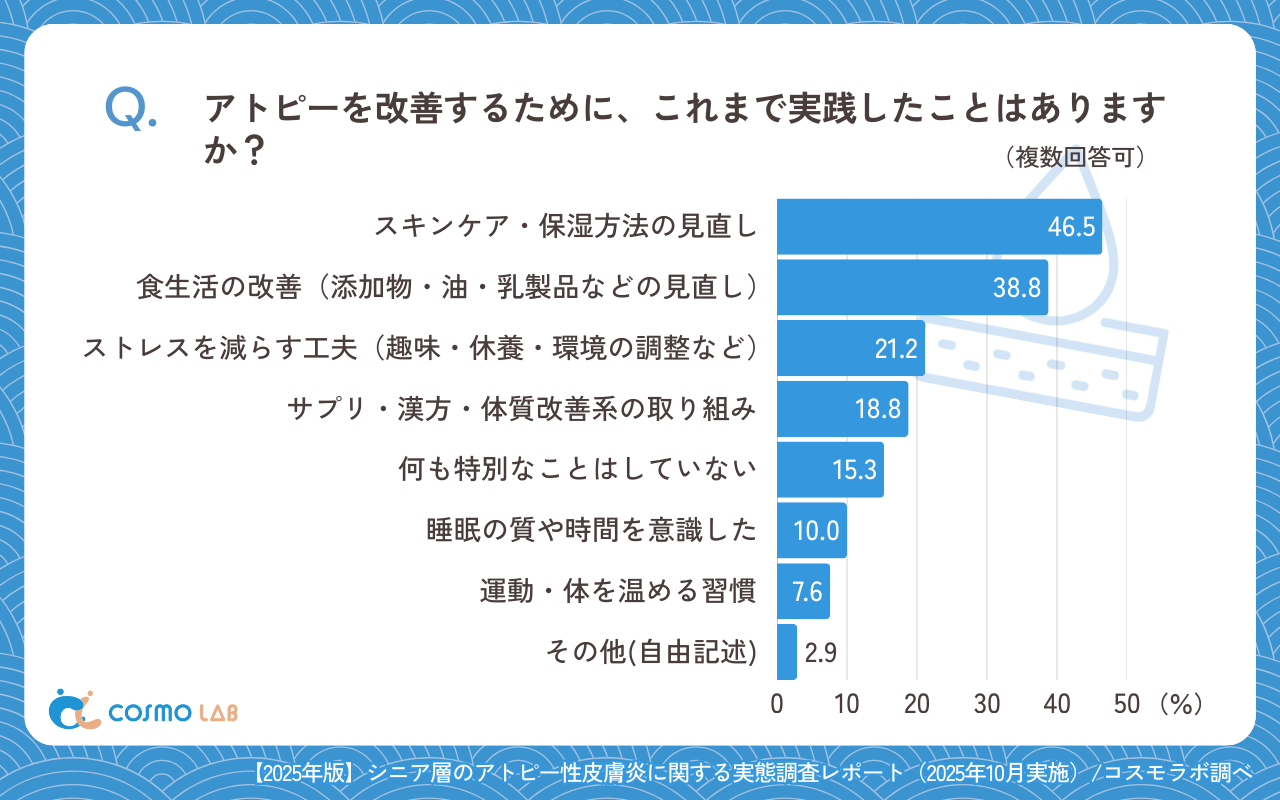 「スキンケア・保湿方法の見直し」(46.5%)が最多で、「食生活の改善(添加物・油・乳製品などの見直し)」(38.8%)という回答が続きました。