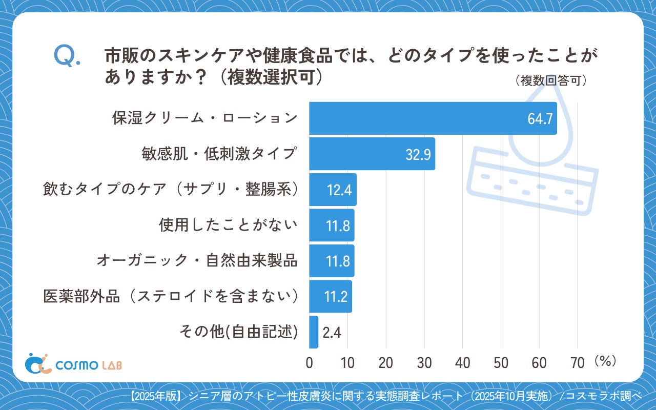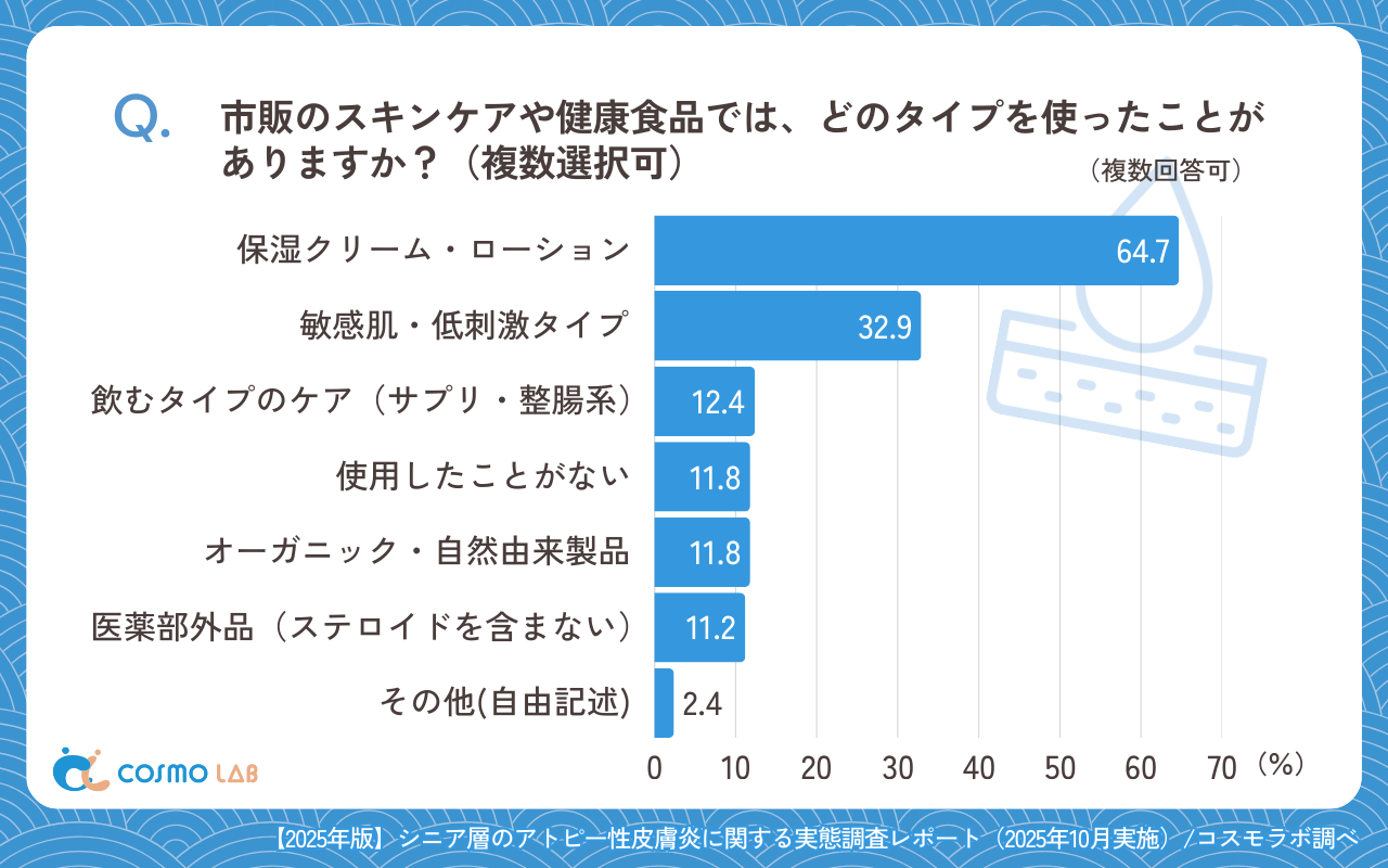 最多は「保湿クリーム・ローション」(64.7%)で、市販品でのケアが中心であると明らかになりました。