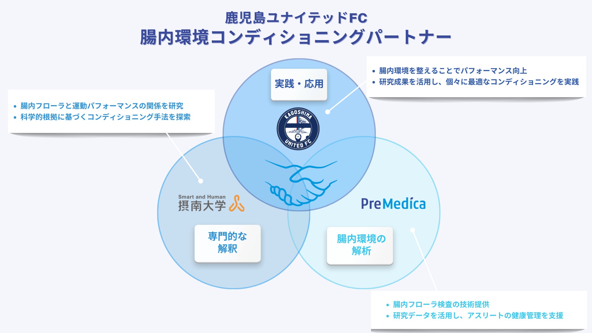 摂南大学(学長:久保康之)と株式会社プリメディカ(代表取締役社長兼CEO:富永朋)は、明治安田J3リーグに所属する鹿児島ユナイテッドFCの「腸内環境コンディショニングパートナー」に就任し、「腸内細菌叢(さいきんそう)の動態と運動パフォーマンスへの影響を知ること」を目的とした共同研究を開始します。