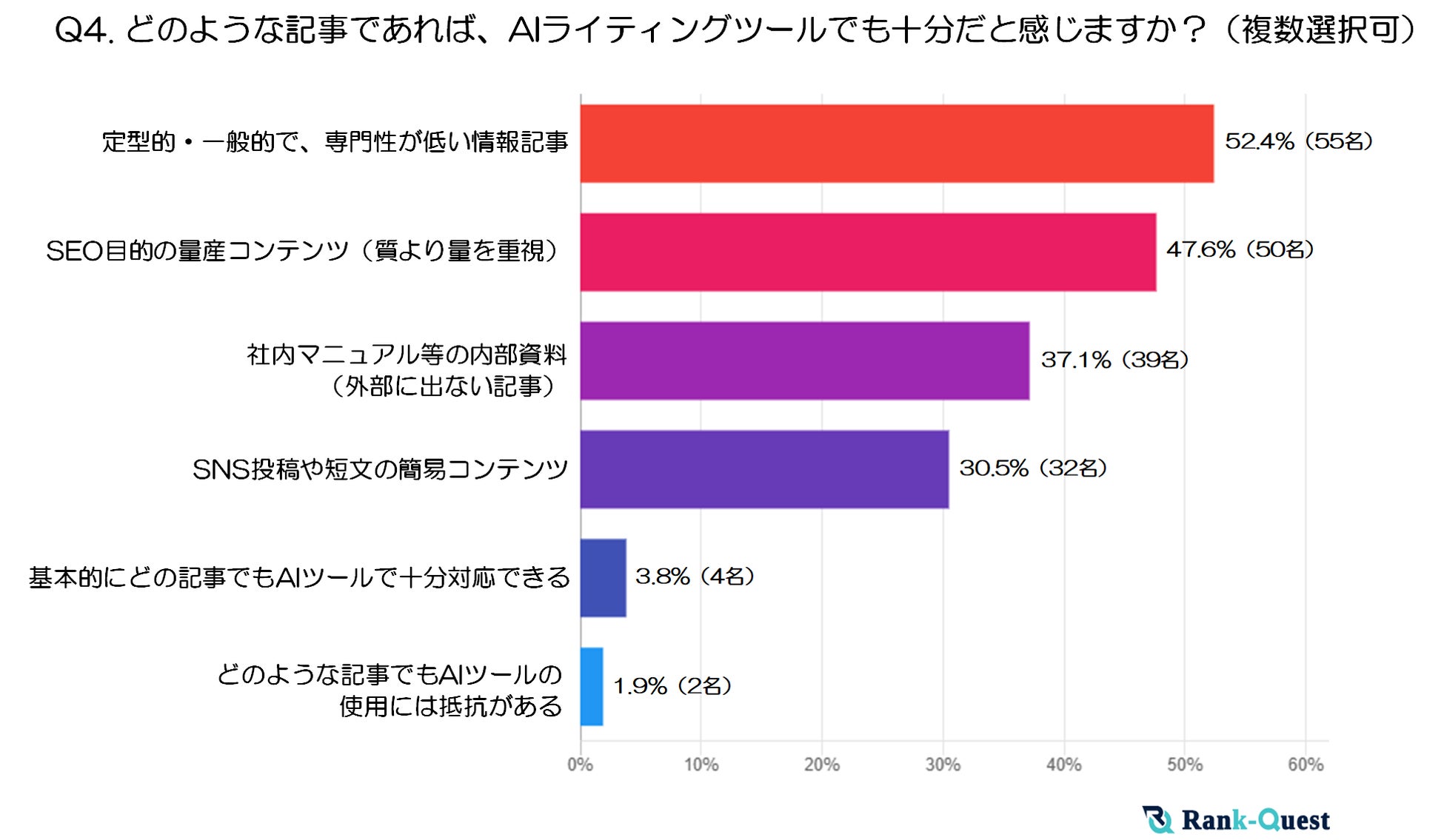 この結果からは、多くの人が“専門性やクリエイティビティがさほど求められないコンテンツ”であれば、AIツールでも十分に対応できると考えている傾向がうかがえます。
