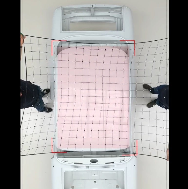 そこで、このターゲットネットは、1.5×2.5mのネットに、合計300個のマグネット付きのマーカーが予め取り付けられています。3Dスキャン時には、右の様に対象物の表面を覆うように被せるだけで、スキャン効率が大幅にUPします。