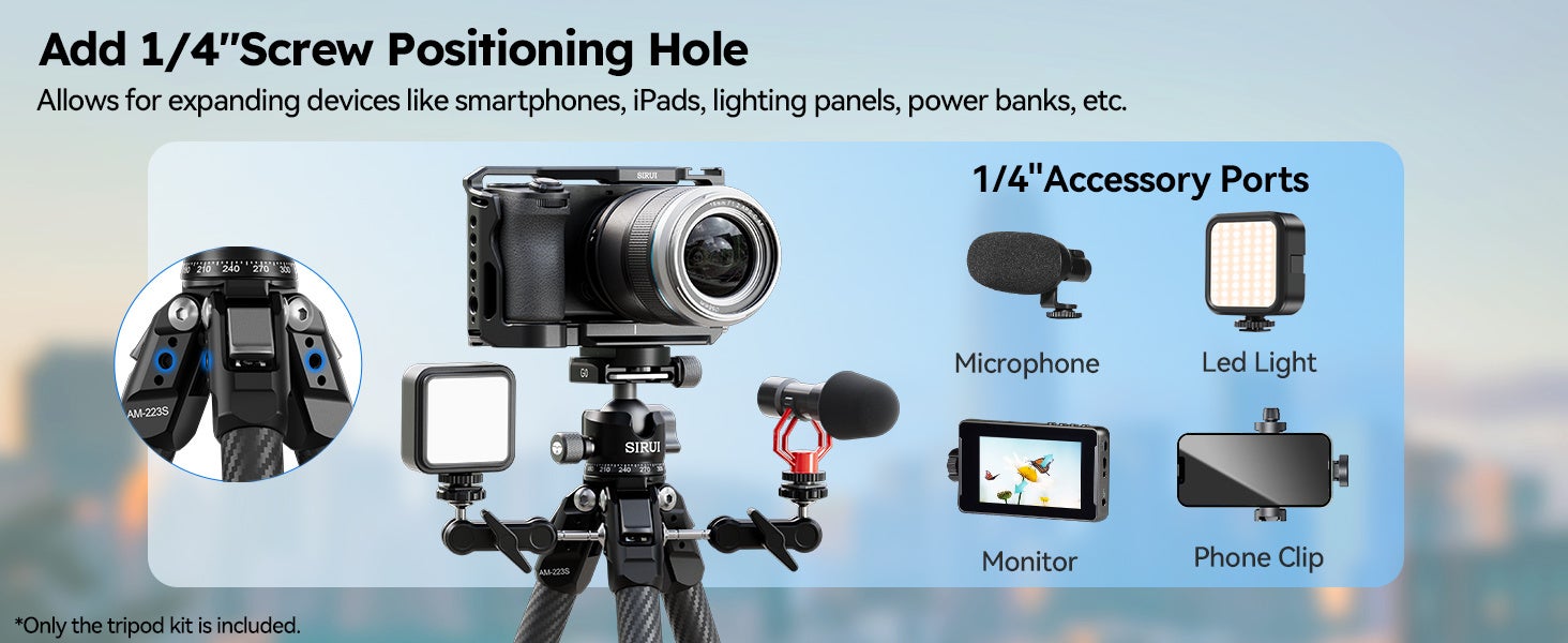 1/4インチ&3/8インチのデュアルネジインターフェースを装備。DSLR/ミラーレスはもちろん、アクションカメラやスマートフォンまで幅広い機器に対応します。