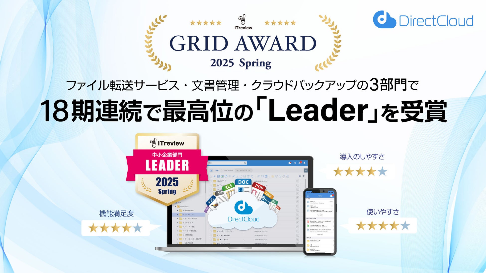 DirectCloudで更なるドキュメントデータ活用を推進する株式会社ダイレクトクラウド(本社:東京都港区、代表取締役:安 貞善、以下ダイレクトクラウド)が提供する、法人向けクラウドストレージ「DirectCloud」は、アイティクラウド株式会社(本社:東京都港区、代表取締役社長兼CEO:黒野 源太)が運営するビジネス向けIT製品・クラウドサービスのレビュープラットフォーム「ITreview(アイティレビュー)」において、「ITreview Grid Award 2025 Spring」の3部門で18期連続最高位の「Leader」を受賞しました。