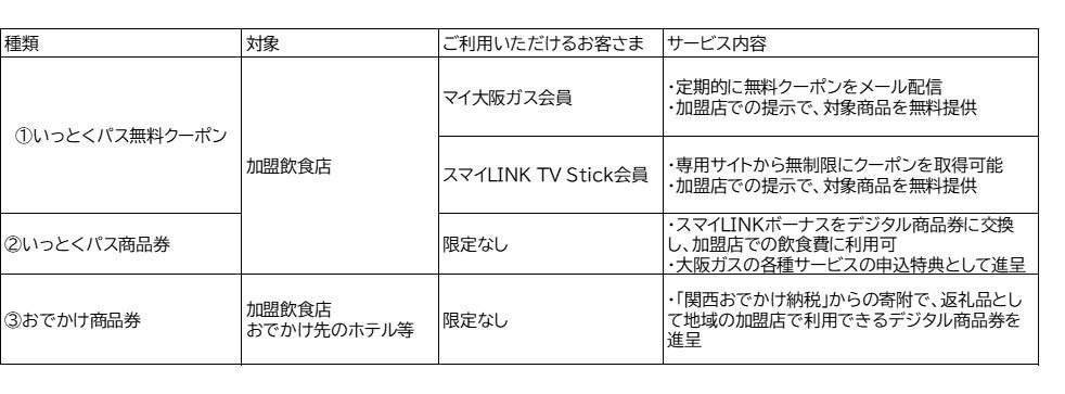 「いっとくパス」とは、大阪ガスが運営する、家庭用のお客さまと飲食店をつなぐデジタルチケットサービスです。運用基盤として「e街プラットフォーム®️」(運営:株式会社ギフティ)を活用しています。無料クーポンの配布やポイントによるデジタル商品券への交換等を通じて、加盟店でお得に飲食いただけます。また、本デジタルインフラを活用し、現地消費型のふるさと納税である「関西おでかけ納税」およびその返礼品として地域の飲食店で利用できる電子商品券「おでかけ商品券」も発行されています。