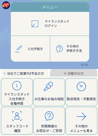 この度の機能拡充のポイントは主に4つで、①従来紙で受け付けていた入職手続きをLINE上で行えるようにするほか、②当日の欠勤・遅刻・早退の連絡をLINEで受け付け、支店全体で状況をタイムラグなく把握できるようにいたします。さらに、③ランスタッド社員に対するご意見やご相談を受け付ける導線を分かりやすく表示し、より相談しやすい環境を整備します。また④求職中の方と就業中の方が使うメニュー画面のベースカラーを変え、どこを見ればよいか分かりやすいデザインに変更いたします。