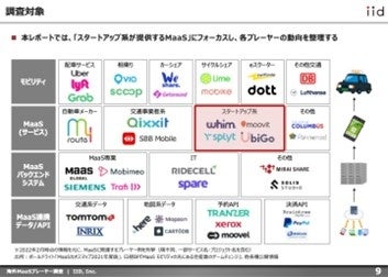 本調査では、海外の「スタートアップ企業が主導するMaaS」にフォーカスし、各プレーヤーの動向を整理してレポートとして可視化した。日本ではあまり馴染みのない企業をはじめ、三井不動産と提携し首都圏で試験的にサービスを提供しているWhimなど計9社が提供しているサービスの概要や展開地域といった情報を収集し、整理・分析を行った。