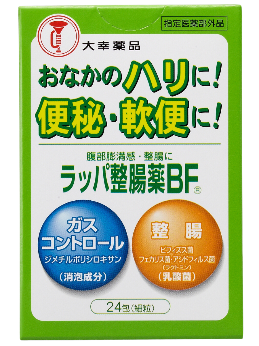 『ラッパ整腸薬BF』は、1995年に誕生したお腹の不快感を改善する整腸剤です。主成分「ジメチルポリシロキサン」の消泡作用と「3つの乳酸菌」による快腸へのWアクションで、お腹のハリ(腹部膨満感)やガス(おなら)が頻繁に出る、便が出づらいといったお腹の症状に効果を発揮します。少し甘みのある飲みやすい細粒で3才以上のお子様からお年寄りの方まで服用していただけるので、長年にわたり多くの皆様から親しまれています。