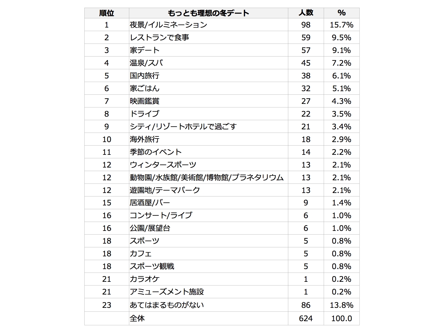 理想の冬デートは、1位「夜景/イルミネーション」、2位「レストランで食事」、3位「家デート」
