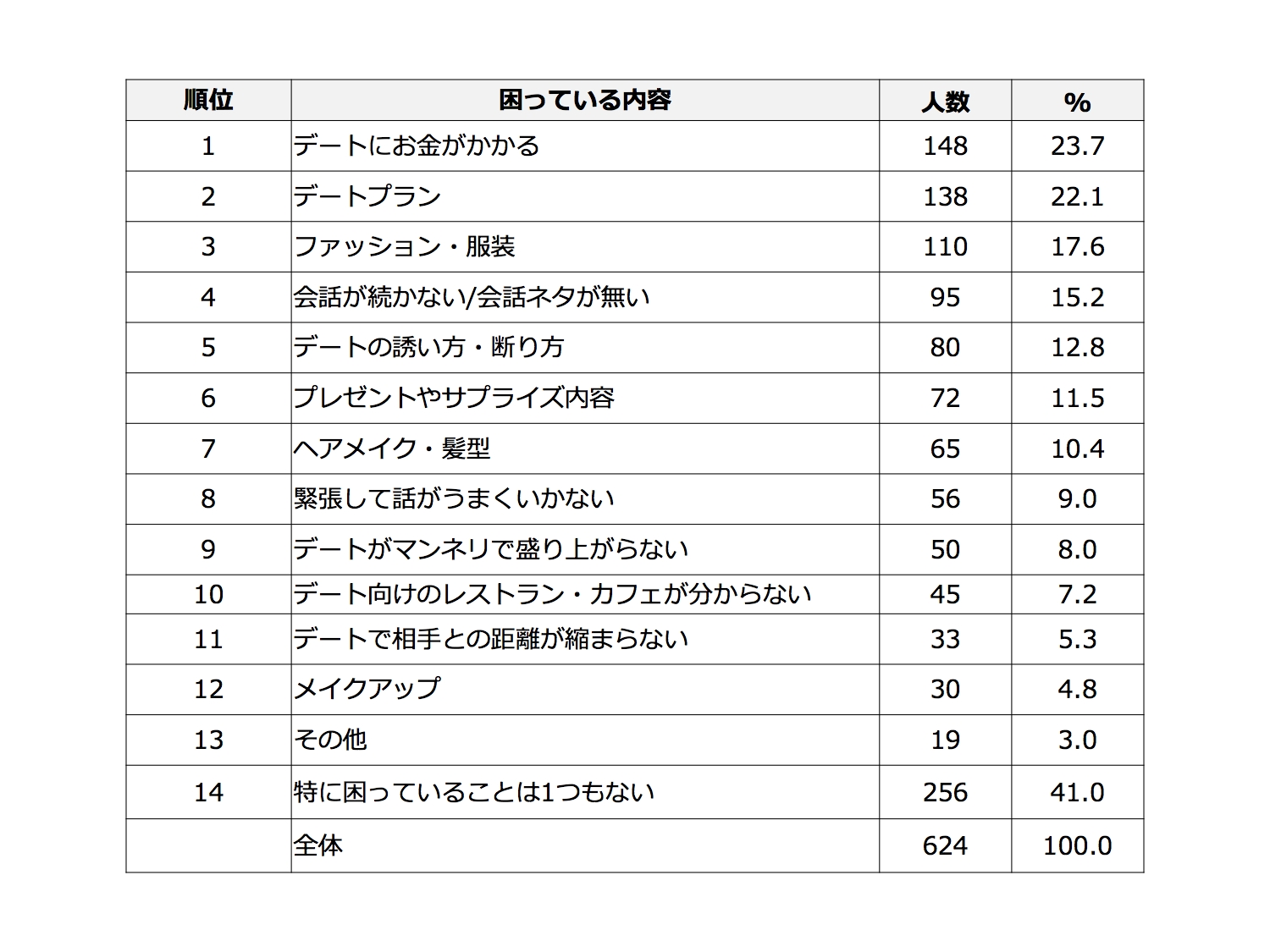 1. 独身男女の20%がデートを迎えるにあたり困っている(n=624)