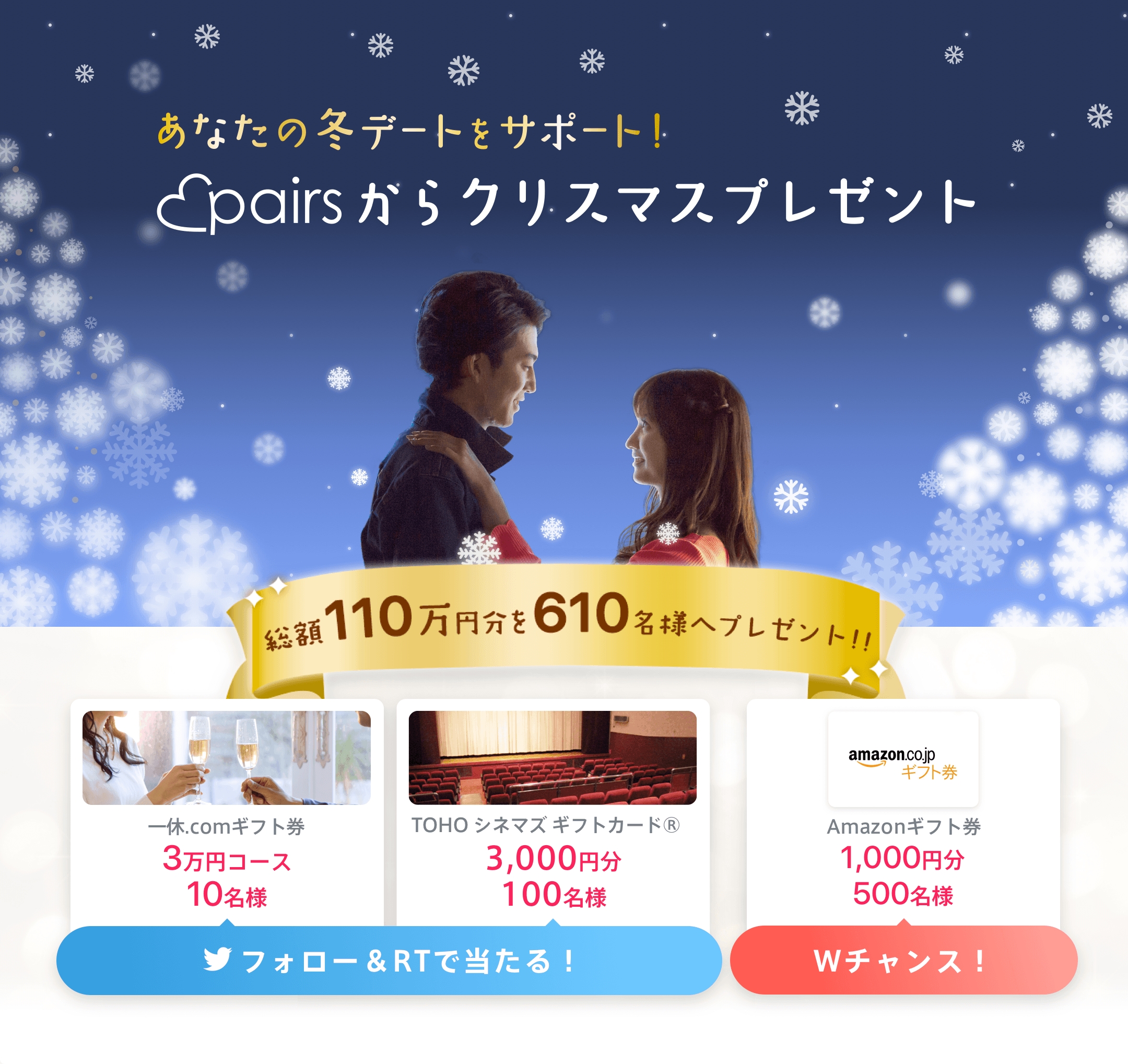 Twitter × 国内最大級の恋愛・婚活マッチングサービス『Pairs』、総額110万円分を610名様にプレゼント! Pairs冬デート応援キャンペーン開催