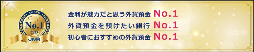 このたび、日本マーケティングリサーチ機構が実施した外貨預金のブランドイメージ調査(2023年5月期)において、「金利が魅力だと思う外貨預金」「外貨預金を預けたい銀行」「初心者におすすめの外貨預金」 の3項目で第1位となりました。昨年の同調査(2022年4月期)に続き、2年連続での三冠受賞です。