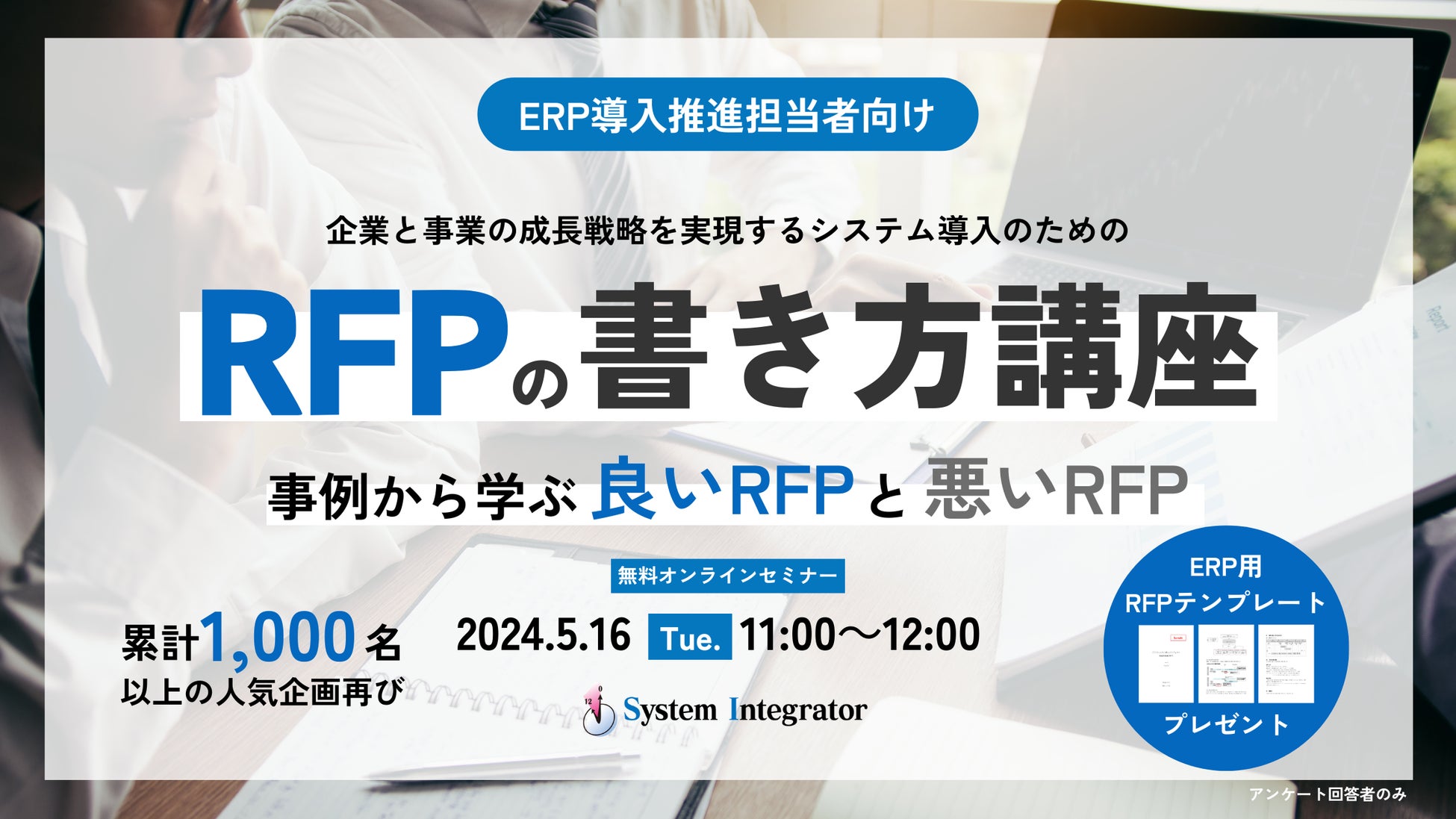 株式会社システムインテグレータ(本社:さいたま市中央区、代表取締役社長:引屋敷 智、東証スタンダード:証券コード3826)は、2024年5月16日(木)に無料ウェビナー 「ERP導入を成功させるRFPの書き方講座 ~事例から学ぶ良いRFPと悪いRFP~」を開催することをお知らせします。