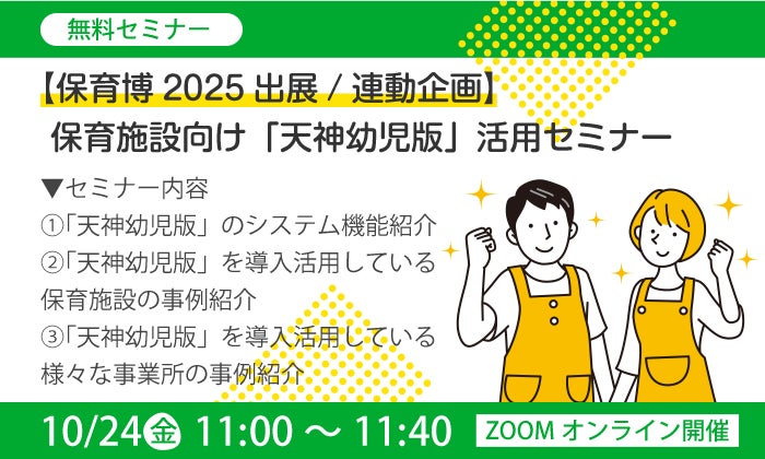 保育施設向けICT教材『天神』を開発・提供する株式会社タオ(本社:滋賀県草津市、代表取締役:黒澤慶昭)は、「保育博2025」への出展に先立ち、2025年10月24日(金)に『天神 幼児版』の魅力をいち早くお届けする無料オンラインセミナーを開催いたします。