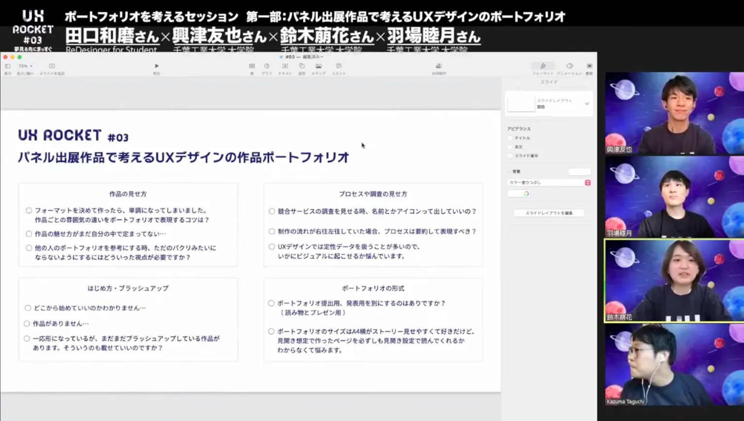 イベントは、就職活動を控えたデザイナー志望の大学生向けの内容だけではありません。YouTubeでの配信では一般の方に向け、デザイン教育を受けた学生が今の考えをプレゼンするトークセッションもありますし、学生たちの作品を展示したオンライン展示“UX Galaxy”もあります。一般の方もぜひご参加ください。