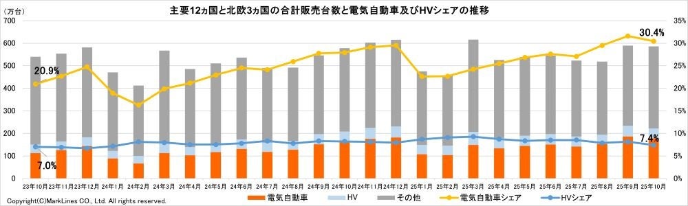 主要12カ国とノルウェー、スウェーデン、フィンランドの北欧3カ国(計15カ国)における10月の電気自動車販売台数は178.3万台だった。前月比で4.3%減少したが、前年同月比では10.5%増加した。また、10月の電気自動車シェアは30.4%で、前月比で1.2ポイント減、前年同月比では2.5ポイント増加した。2025年1-10月の電気自動車累計販売台数は、前年同期比22.9%増の1,449.1万台で、自動車販売台数全体に占めるシェアは26.9%となった。