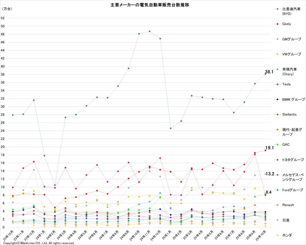 首位はBYDで前月から2.4万台増の38.1万台だった。2位のGeelyは前月から0.6万台増で19.1万台。3位はGMグループで前月から0.3万台増の13.2万台。VWグループは前月から1.2万台減の8.4万台。5位は奇瑞(Chery)で前月から0.5万台増の8.2万台となった。Teslaは米国での販売減が影響し、前月から10.1万台減少の8.0万台で6位だった。