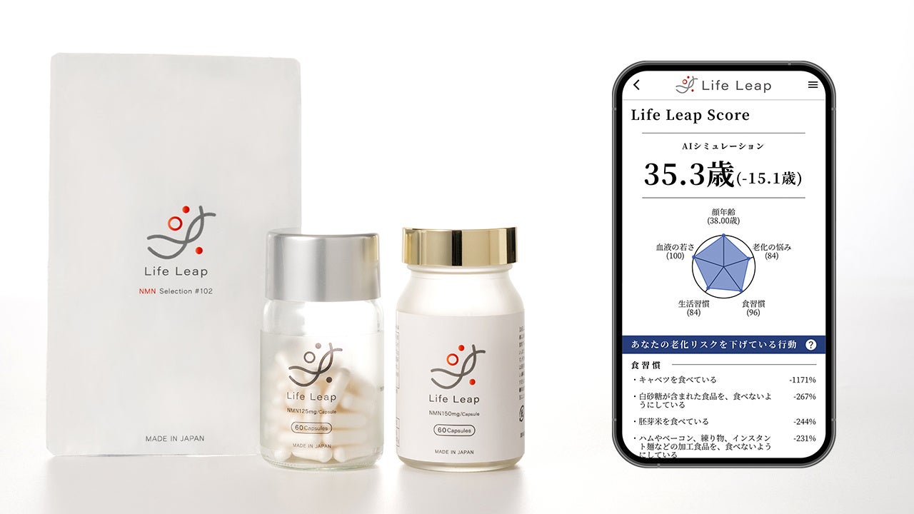 Life LeapではNMNサプリメントの製造と販売を行うだけではなく、AIによる顔年齢判定、統計に基づくAIカウンセリングとアドバイスで総合的にエイジングケアを行います。