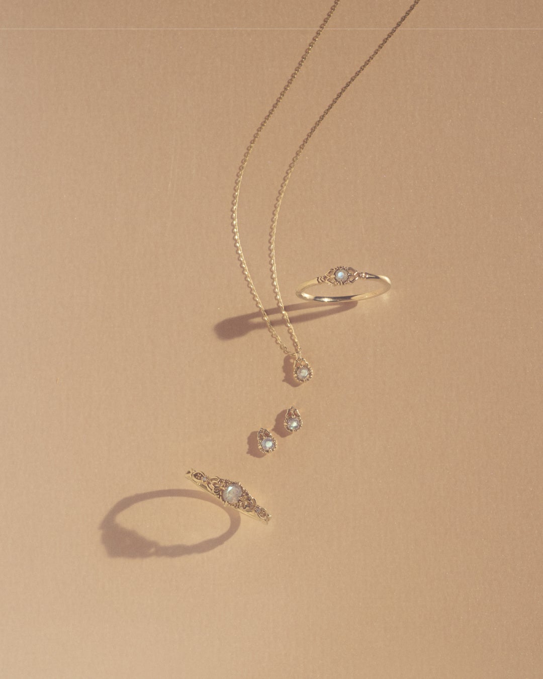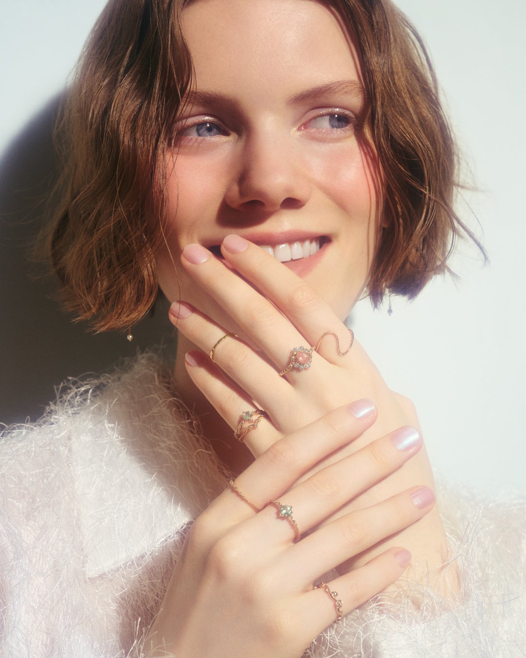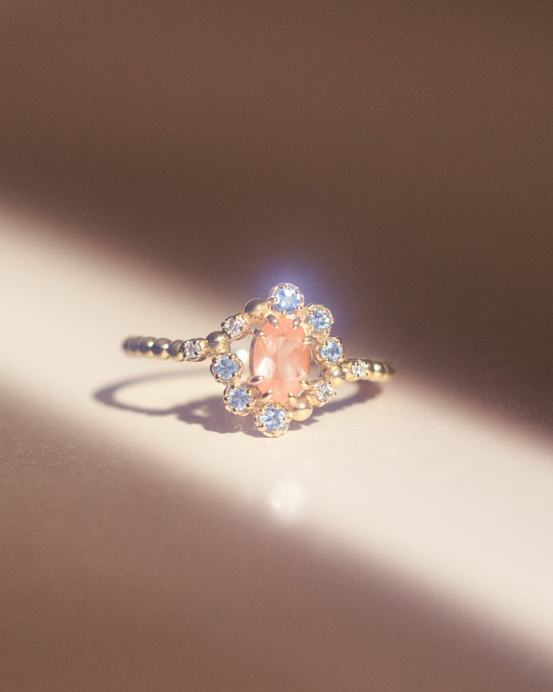 やや大ぶりなトップのリングは1本で主役級。ピーチカラーのアンデシンをアクアマリンとダイヤモンドで囲んだデザインは、夜が明けていく空の様子を表現しています。天然石を贅沢にあしらった、限定コレクションに相応しいスペシャルなアイテムです。