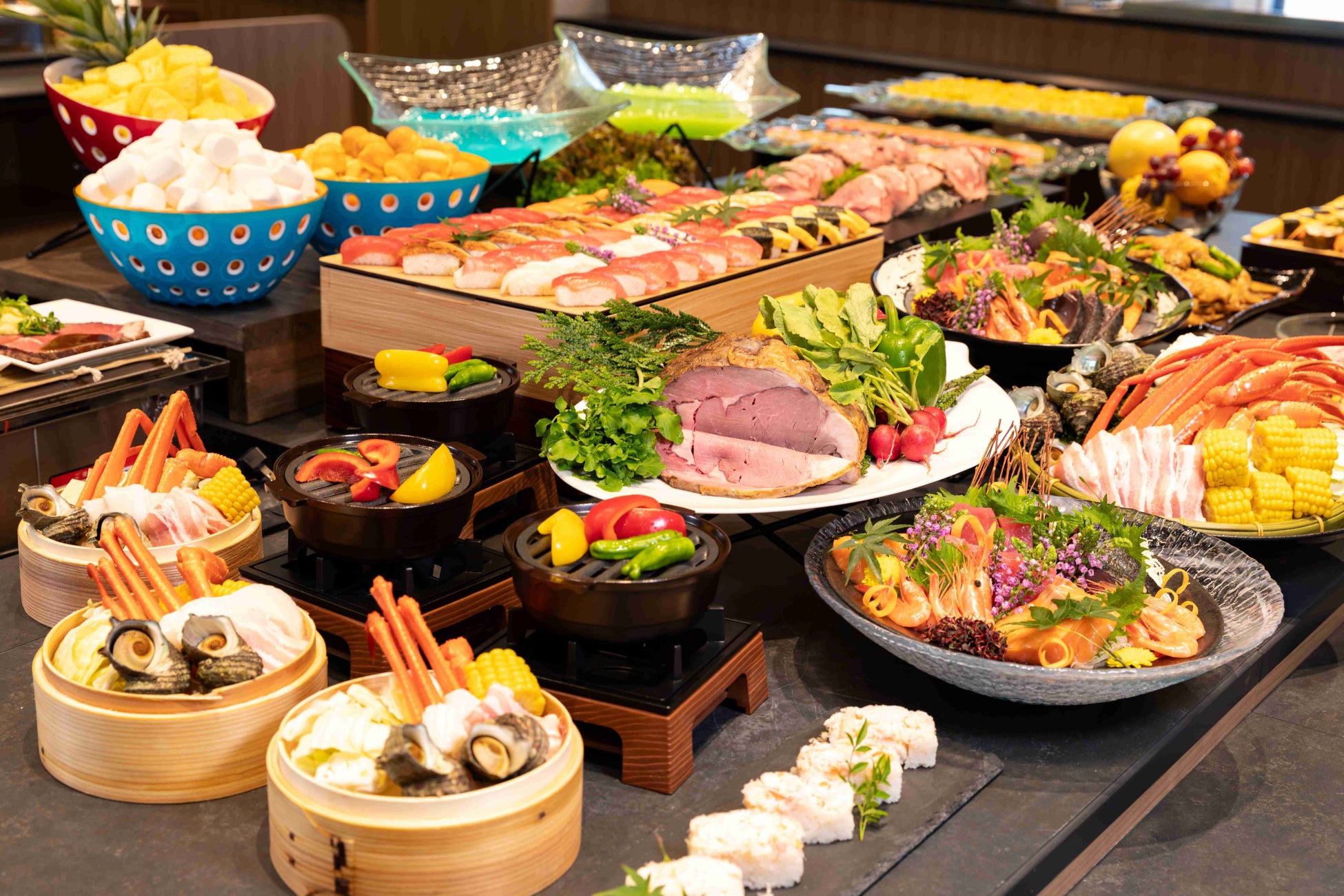 この度のリニューアルで、お食事は湯快リゾートプレミアムタイプのご当地プレミアムバイキングに変更いたします。美味しいバイキング料理を居心地よくお召し上がりいただくため、レストランを移設し、スペースを拡張いたしました。合わせて、実際の調理風景をご覧いただけるライブキッチンスペースも設置し、出来立てのお料理をご提供いたします。夕朝食合わせ160種以上のバイキングメニューをご賞味くださいませ。