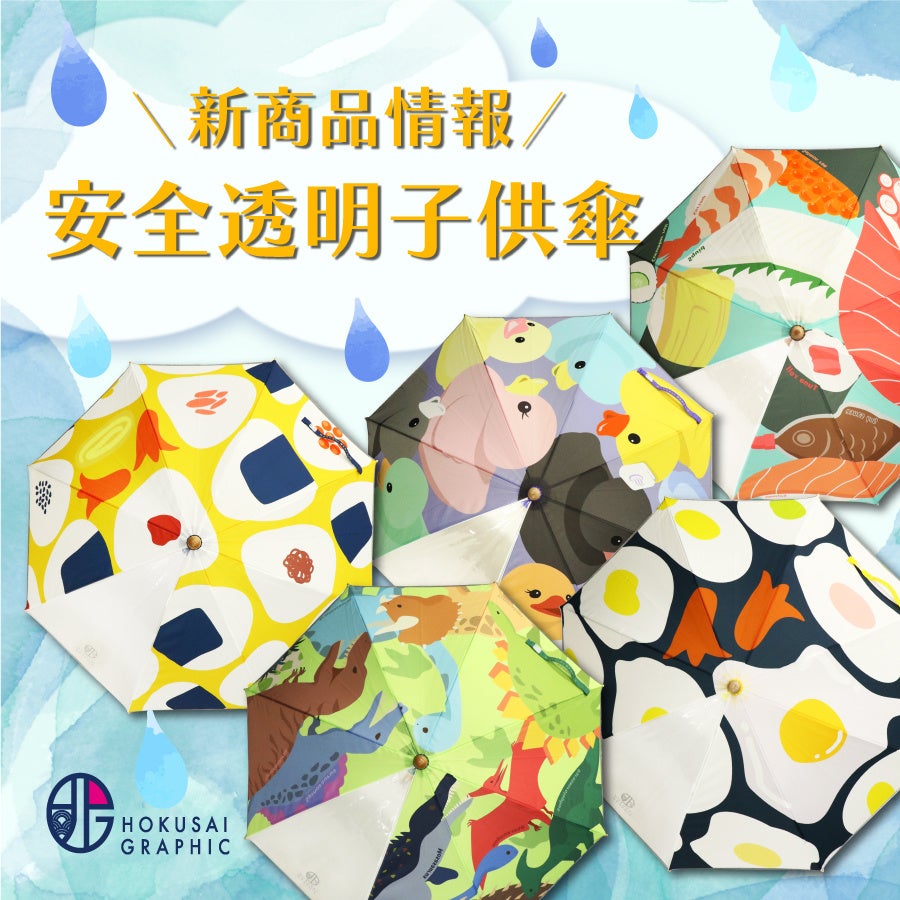 北斎グラフィックから、お子さまの「安全」と「楽しさ」を追求した新作傘コレクションが誕生いたしました。大好きなモチーフたちが傘いっぱいに広がる、遊び心あふれる5つのポップなデザインをご用意しています。「これ、すき!」が見つかる楽しい柄は、子供同士や親子の会話のきっかけにも。さらに、傘の内側に英語の単語を隠した知育の工夫も施しています。
