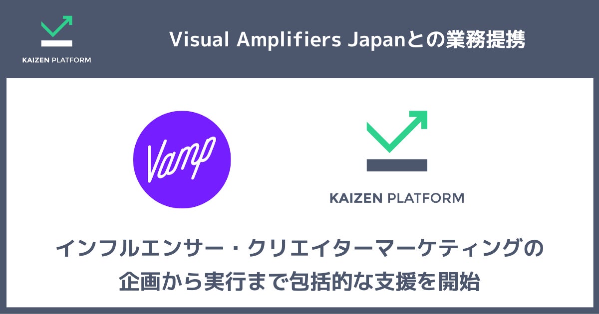株式会社Kaizen Platform(本社:東京都港区、代表取締役:須藤 憲司、以下「Kaizen Platform」)は、インフルエンサー・クリエイターマーケティングのプラットフォームを開発しているVisual Amplifiers Japan株式会社(代表者:Japan Country Manager 竹内 淳、以下「Vamp」)と業務提携しました。今後両社は、お客様のマーケティング課題の解決に向けて、それぞれの強みを組み合わせたインフルエンサー・クリエイターマーケティングの企画から実行まで支援いたします。