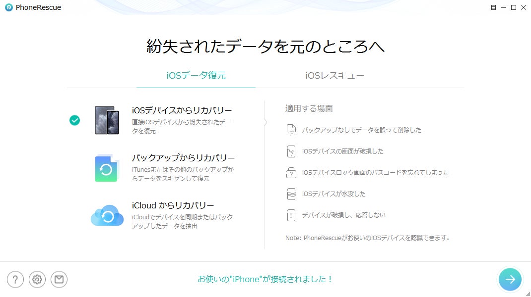 「PhoneRescue for iOS」は専用の復元ソフトとして、iPhone本体からの復元だけでなく、iTunesバックアップ・iCloud同期・iCloudバックアップから特定データだけの復元も支持しています。