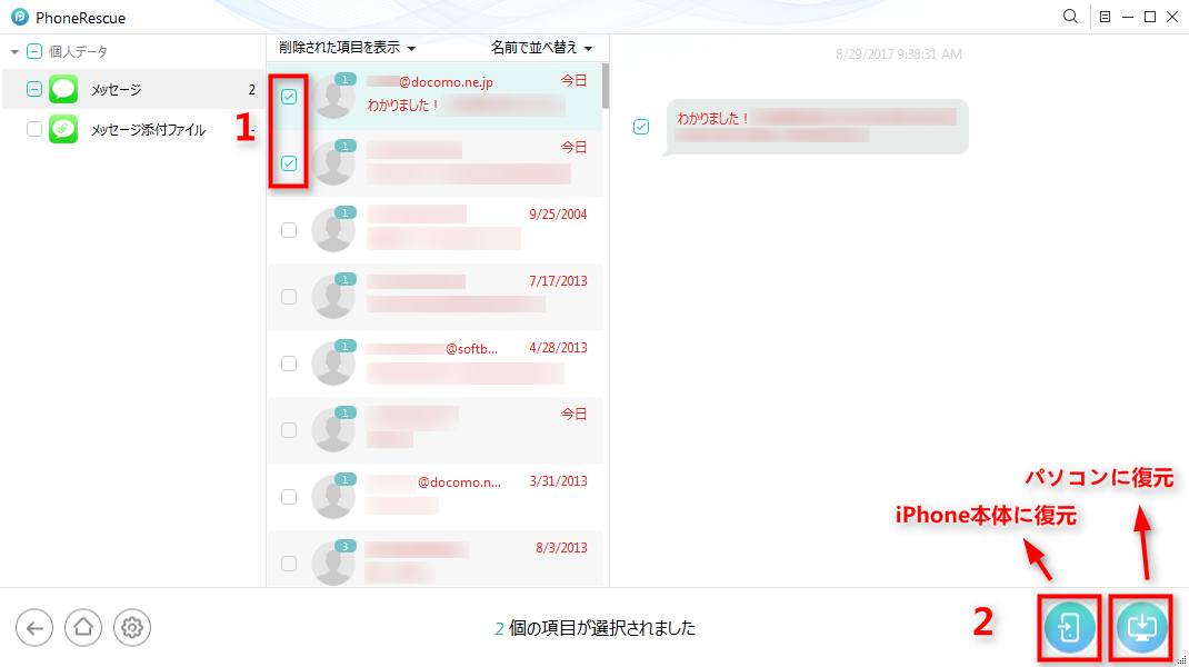 Step 4:復元可能のデータが表示され、復元したいデータを選択して右下の「スマホへ」&「パソコンへ」ボタンをクリックします。