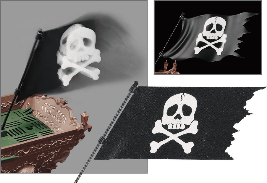 船尾楼に掲げる大海賊旗はプラ製と布製が付属し、布製は内蔵送風機ではためきます。
