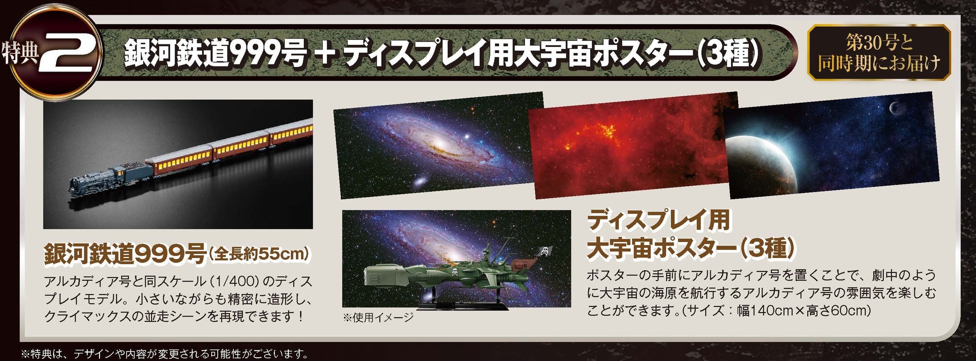 定期購読をお申込みの方にもれなく、どくろをイメージした特製キーホルダー、組み立て途中のパーツを保管できる特製パーツボックス、アルカディア号と同スケールで精密に造形した銀河鉄道999号、モデルの背景として楽しめるディスプレイ用大宇宙ポスター(3種)をプレゼントいたします。詳細は商品ウェブサイトにてご確認いただけます。