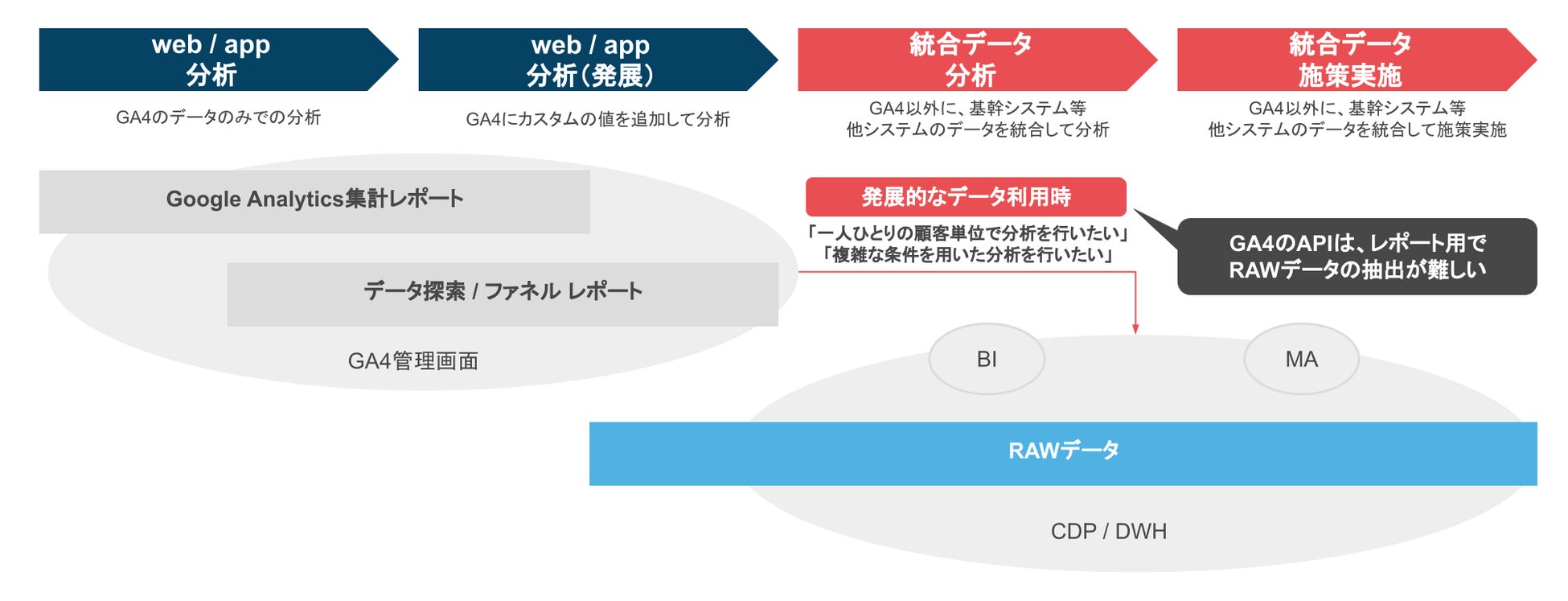 特に、GA4以外のシステム・ツールのデータと組み合わせてGA4のデータを活用するには、RAWデータの利用が不可欠です。