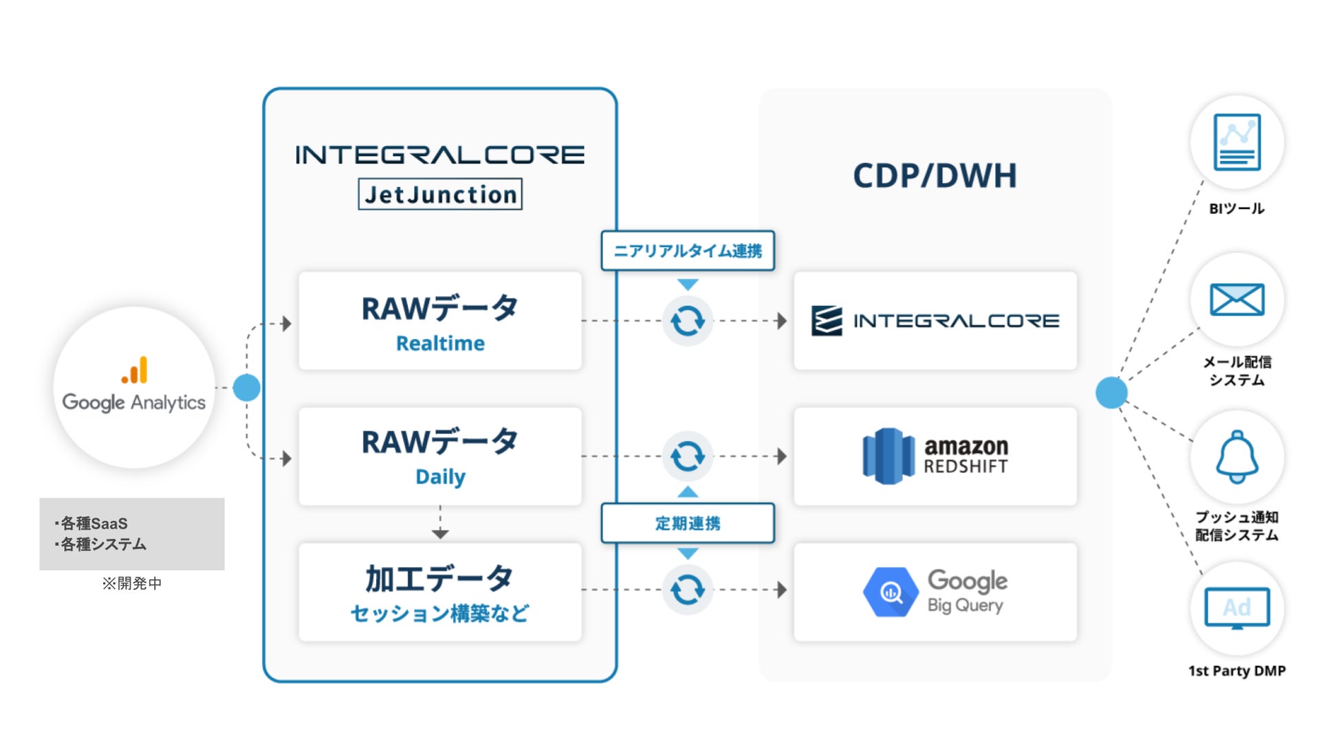 JetJunctionは、当社が開発・提供するCDP「INTEGRAL-CORE」との連携も可能です。CDPとGA4のデータを連携することにより、web・アプリ以外での顧客の行動や情報まで把握することができ、より深い顧客分析が可能になります。