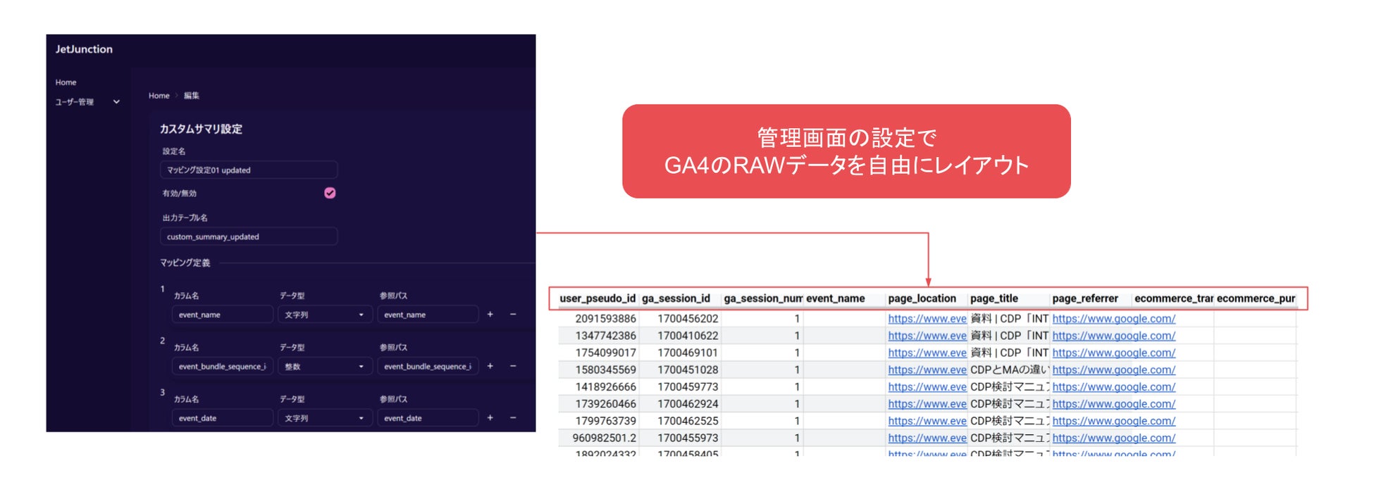 JetJunctionであれば、GA4のRAWデータ活用に伴う加工・連携の作業をJetJunctionの管理画面の操作だけで完結できます。