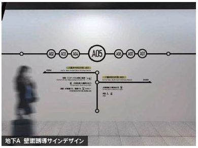 壁面誘導サインのデザインについては、昭和40年頃のバス路線図(※)をモチーフに直線と丸で構成したグラフィックを採用し、長い通路での圧迫感を軽減し、道中を辿る楽しさも演出しています。